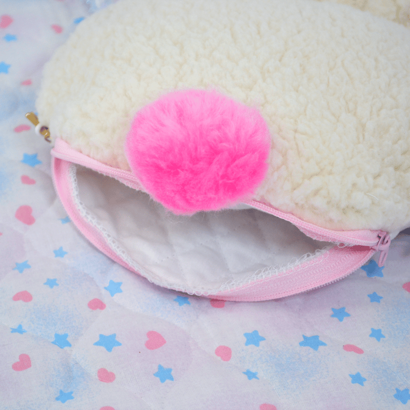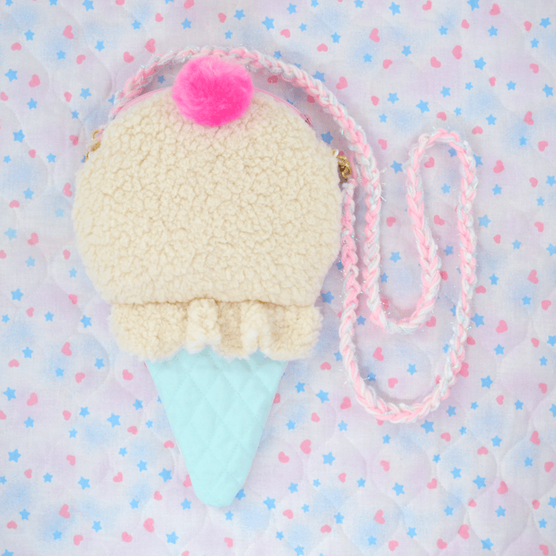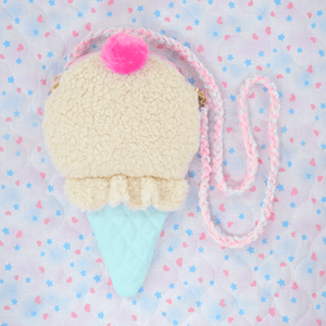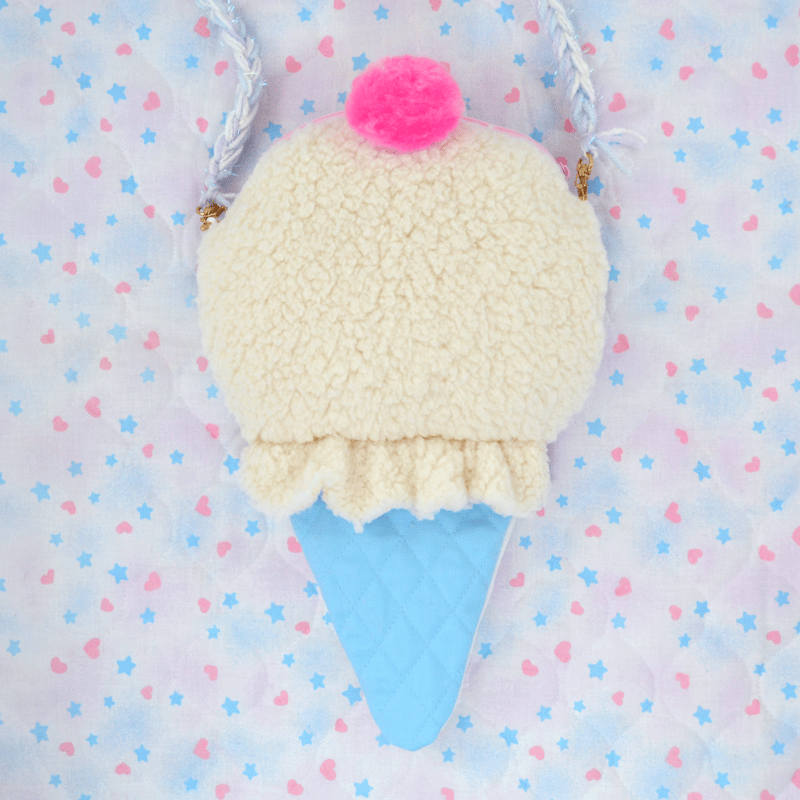 "A soft scoop of ice cream on a quilted cone with a cherry pompom on top~ Each bag has a crochet strap with iridescent accents."