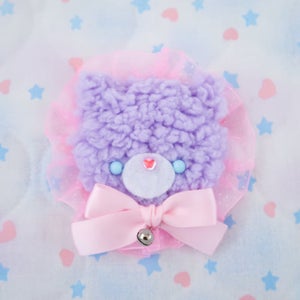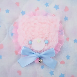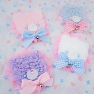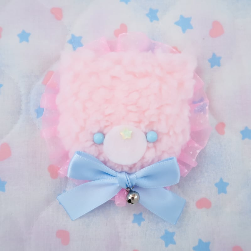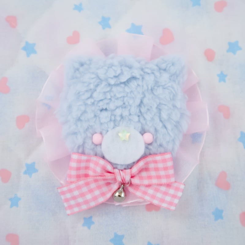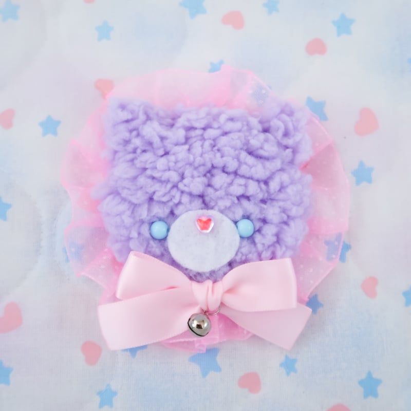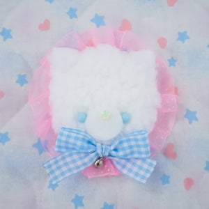 "A soft kitten pin with some happy lace around them and topped off with a bow and bell~"