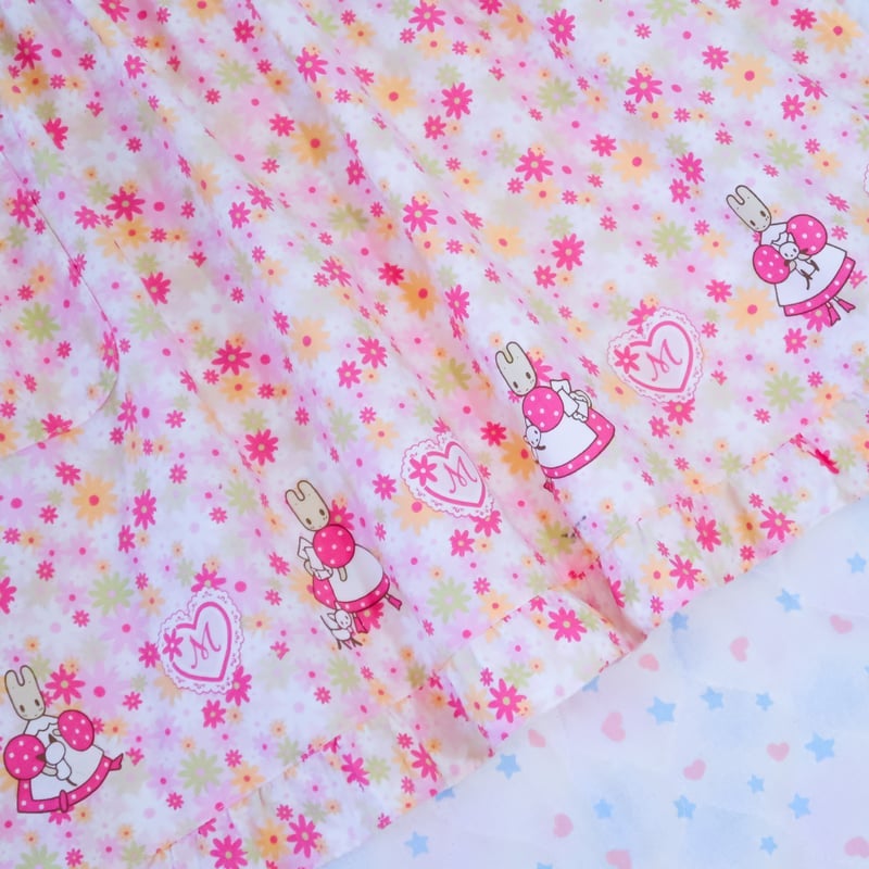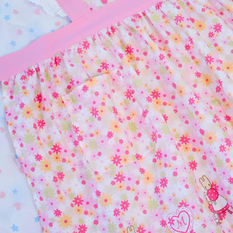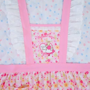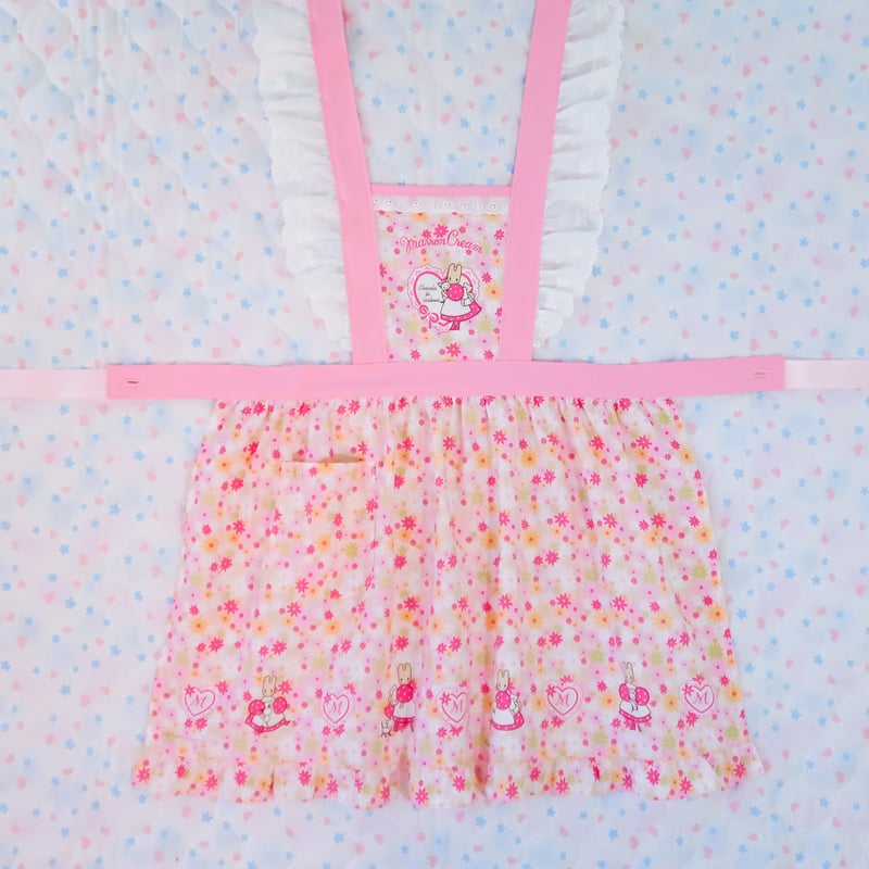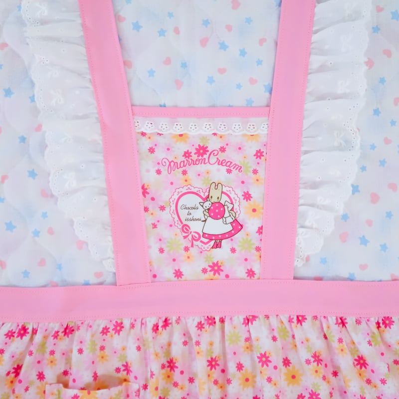 "A super sweet apron of Marron Cream created by using the materials from a vintage smock apron~ This apron features ruffled trim shoulders and a pocket~ The shoulders can also be adjusted to be longer or be crisscrossed on the backside~