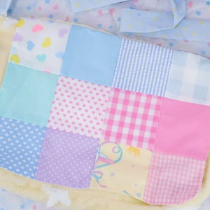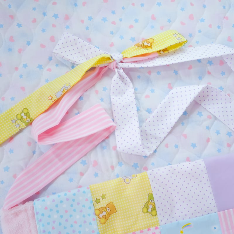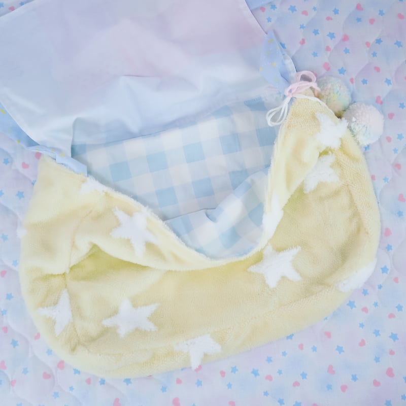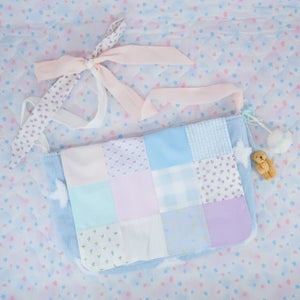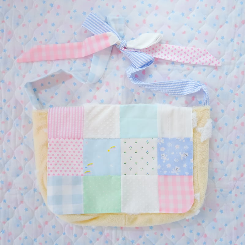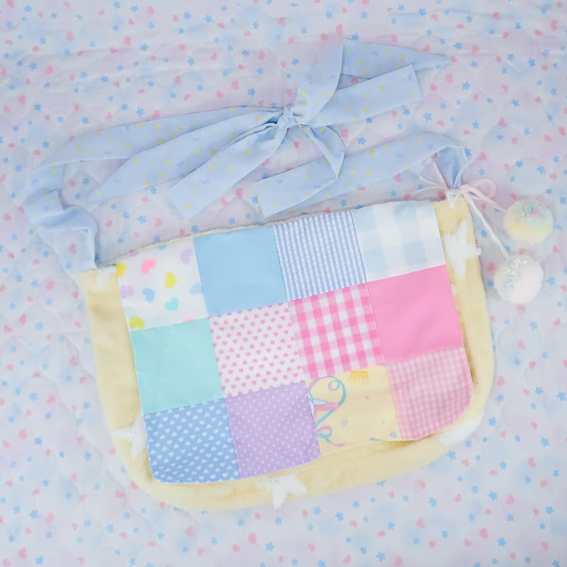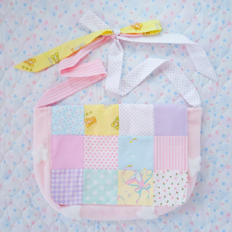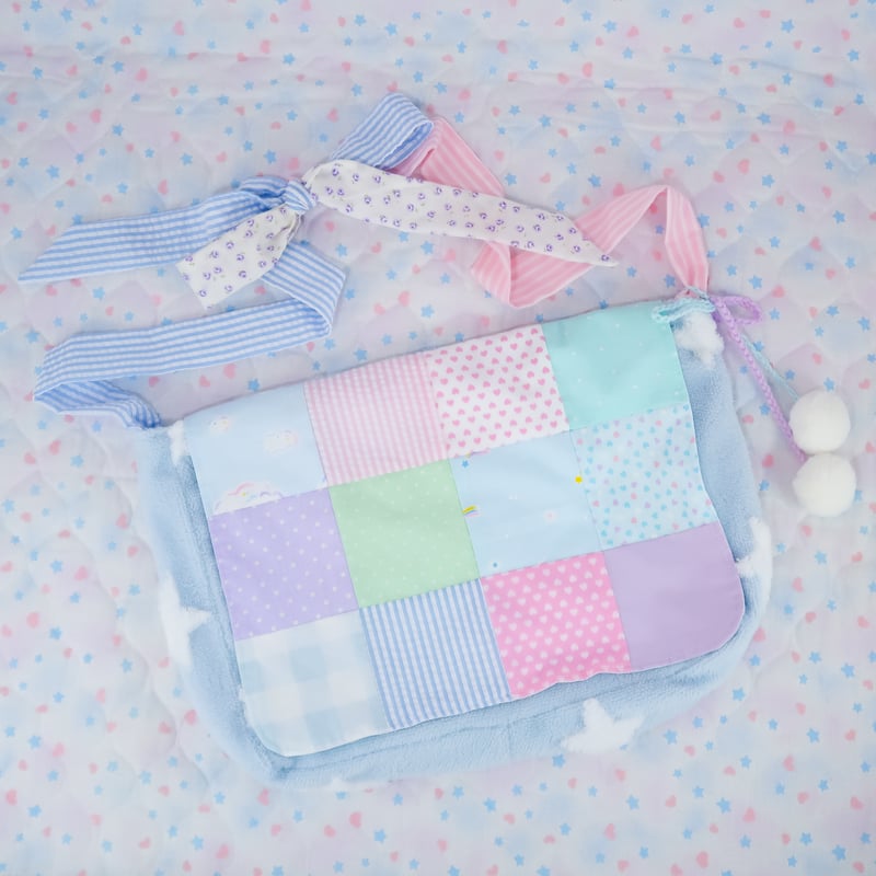 "A messenger bag made from a soft and fluffy star patterned fabric. It also features a quilted flap made from a variety of different patterned fabrics. The shoulder strap's length can be adjusted by untying them and tying it into a knot or bow~"