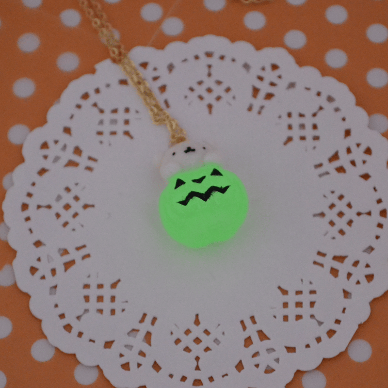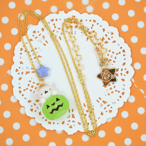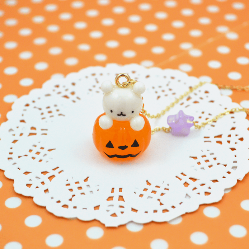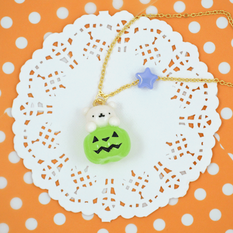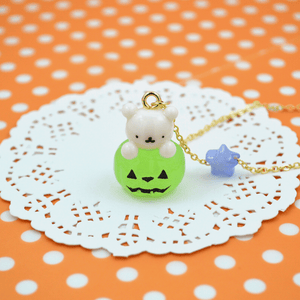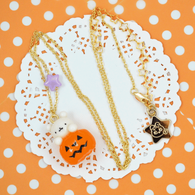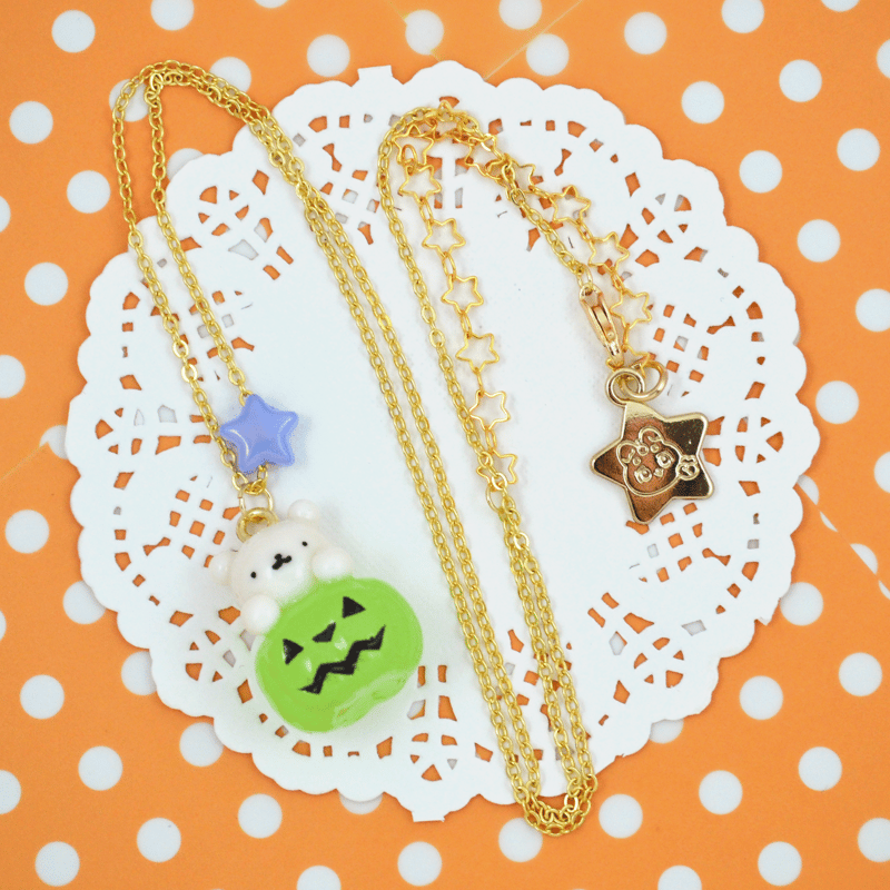 "A silly bear with a transparent pumpkin and star bead on a gold chain~ Each charm is hand-painted and coated with resin for protection!"
