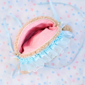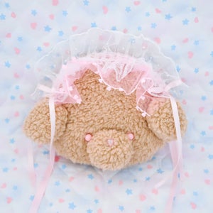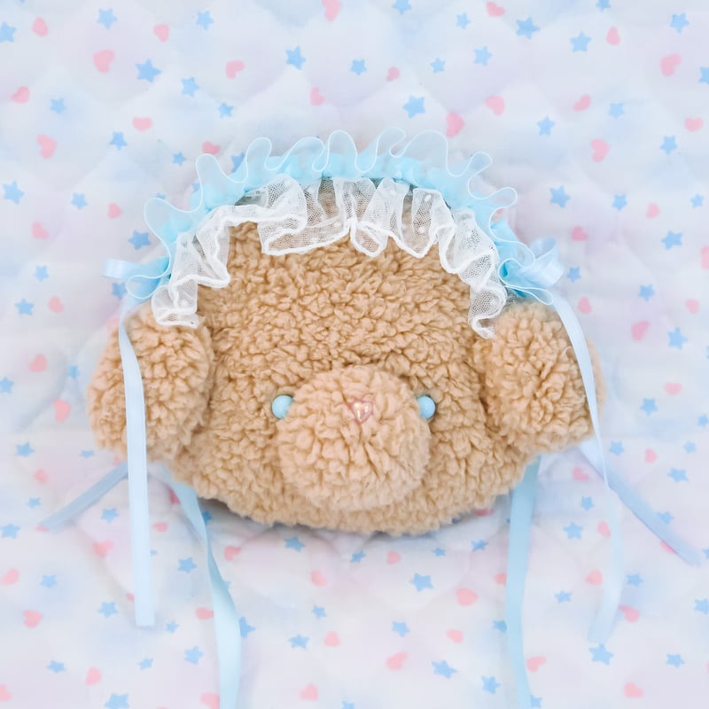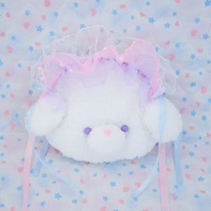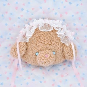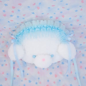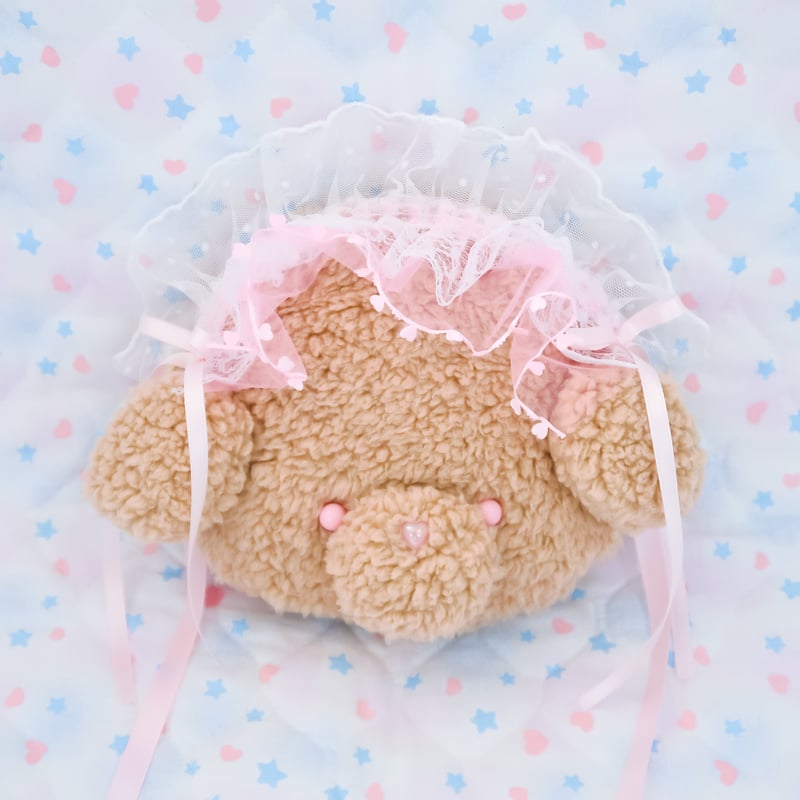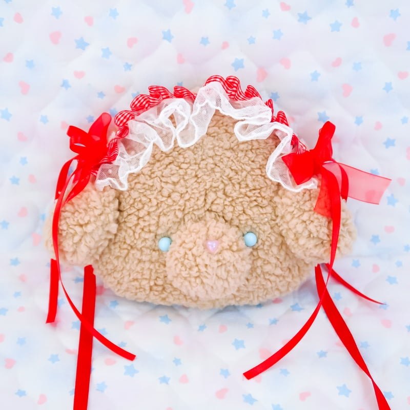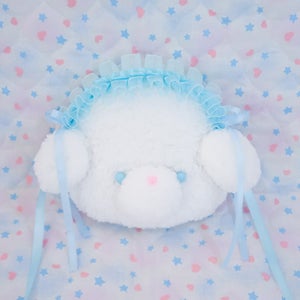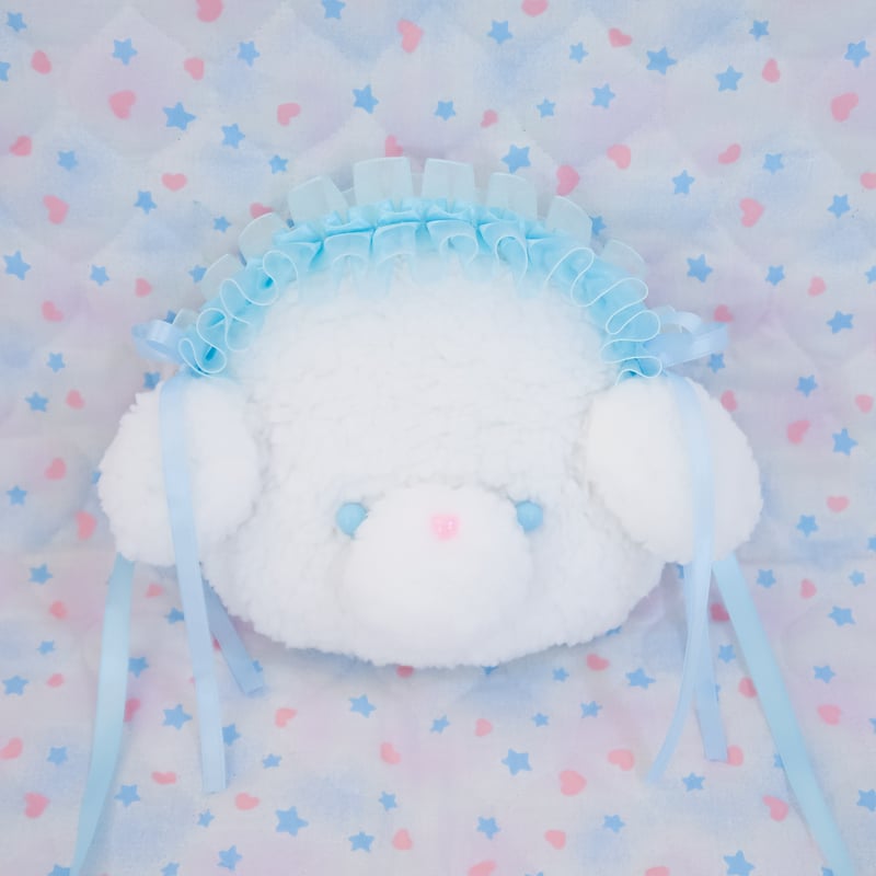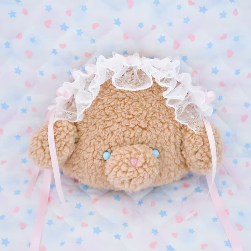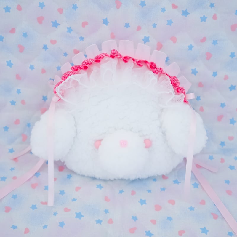 "A soft plush puppy shaped bag~ Each bag has a heart-shaped nose and a ruffley headdress with bows on each side~"