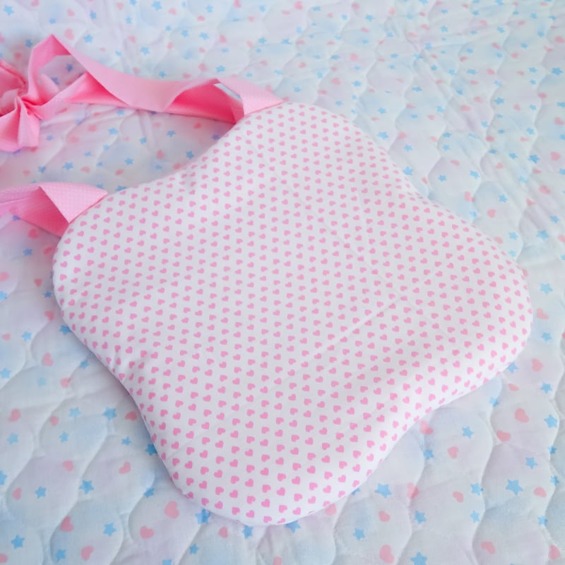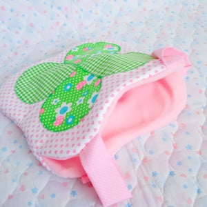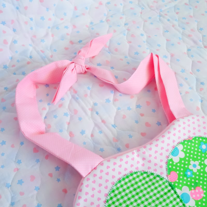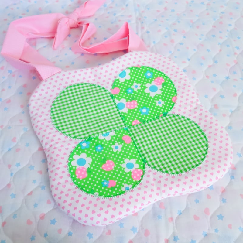 "Clover shaped bag made from different patterns of fabric~ The bag features polka dotted and gingham fabric with pink straps tied together to wear on your shoulder."
