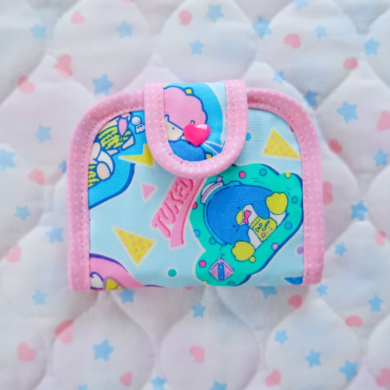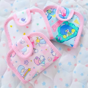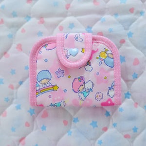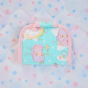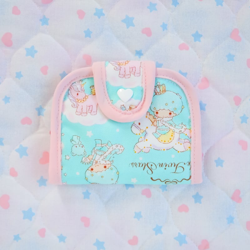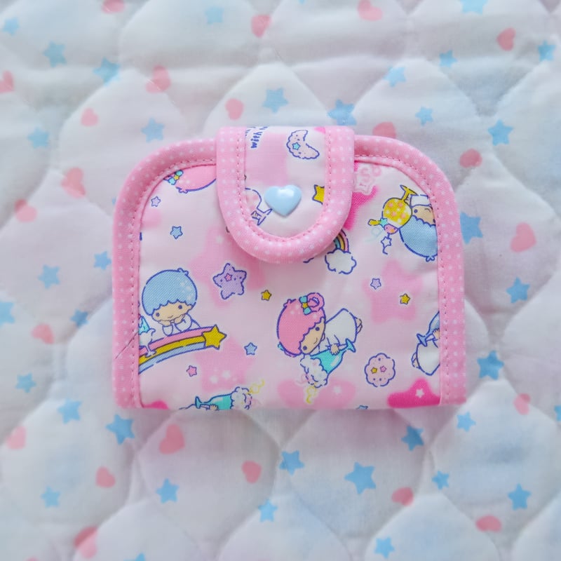 -06: aqua Little Twin Stars print x pink trim x white heart button x silver keychain clasp