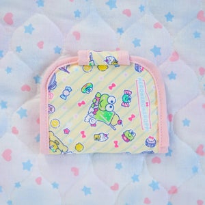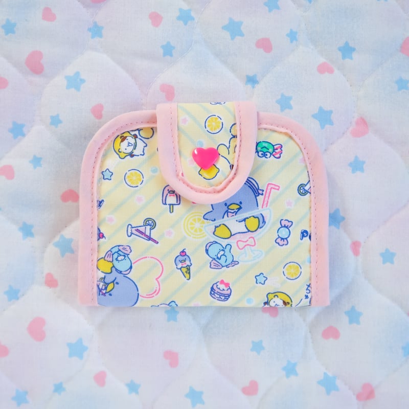 -11: yellow/blue stripe Tuxedo Sam/Keroppi print x pink trim x dark pink heart button x silver keychain clasp