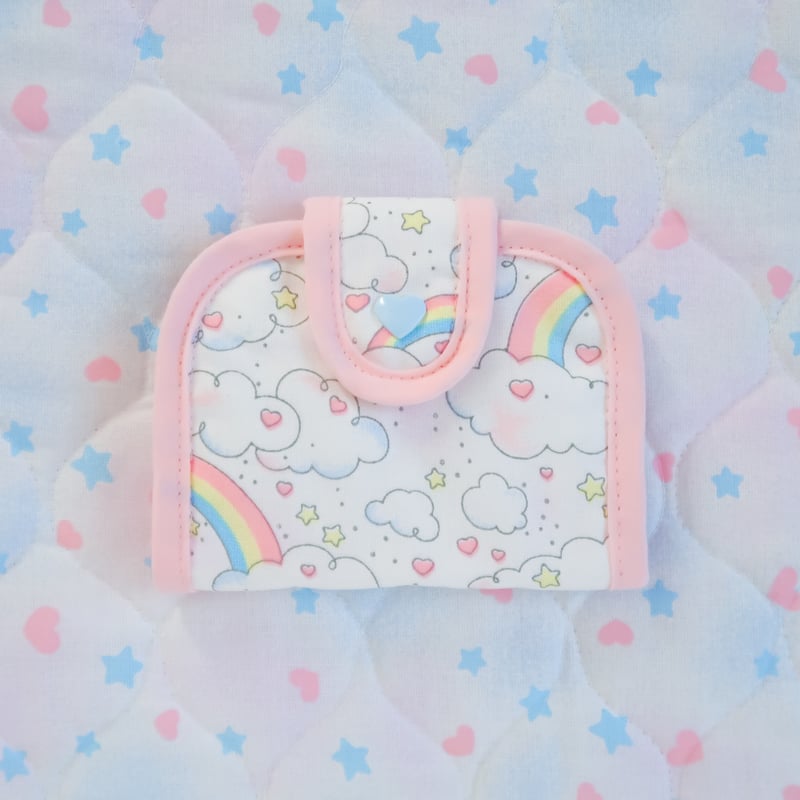 -09: white rainbow print x pink trim x sax blue heart button x silver keychain clasp