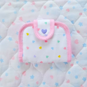 -03: white/multi heart print x pink trim x purple heart button x silver keychain clasp