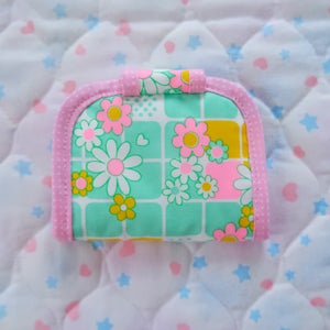 -05: multi floral print x pink/white fine dot trim x white heart button x silver keychain clasp