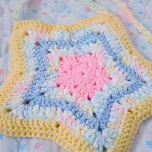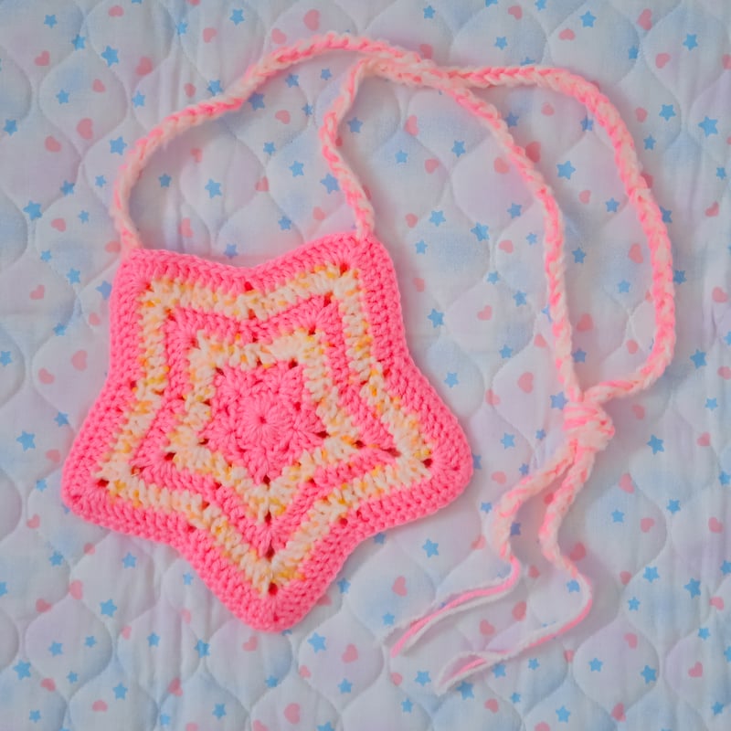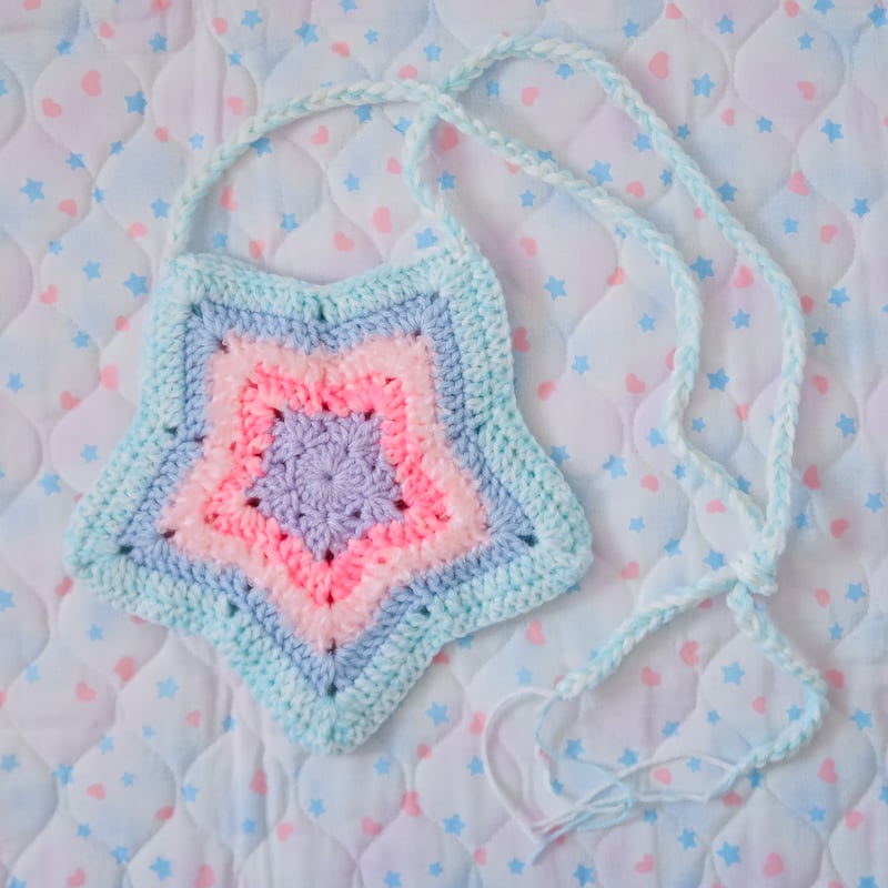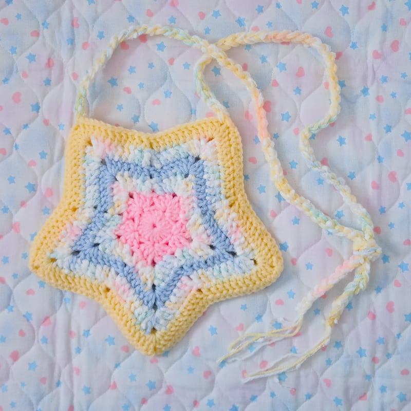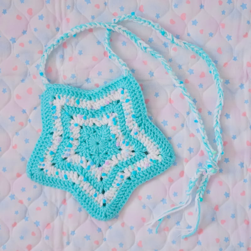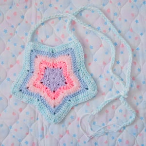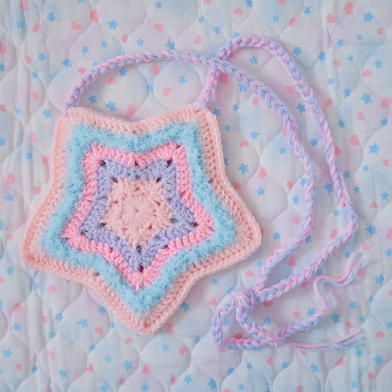 "A crocheted star shaped bag~! This bag features multiple types of yarn including some pompom yarn for added texture~!"