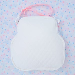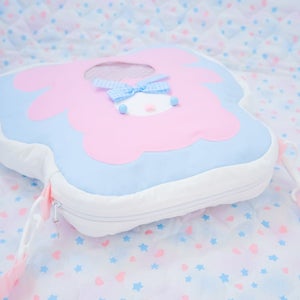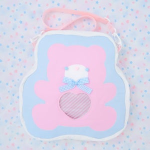 "A bear shaped bag with a heart shaped window in the middle~ The window features glitter and a pocket inside the bag to be used like an ita bag. The bear's face and features are hand sewn and embroidered with a ton of love!"