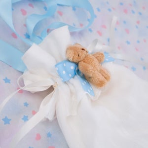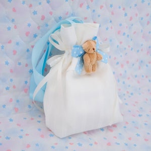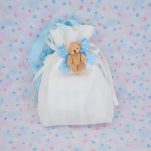 "A light cream drawstring bag with ruffles and a removable bow with a teddy bear on the center~ The bag can be opened and closed with the cream ribbons on the sides."