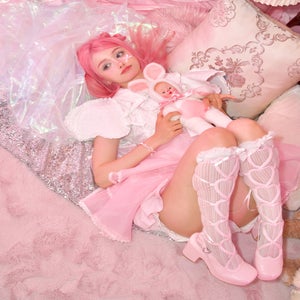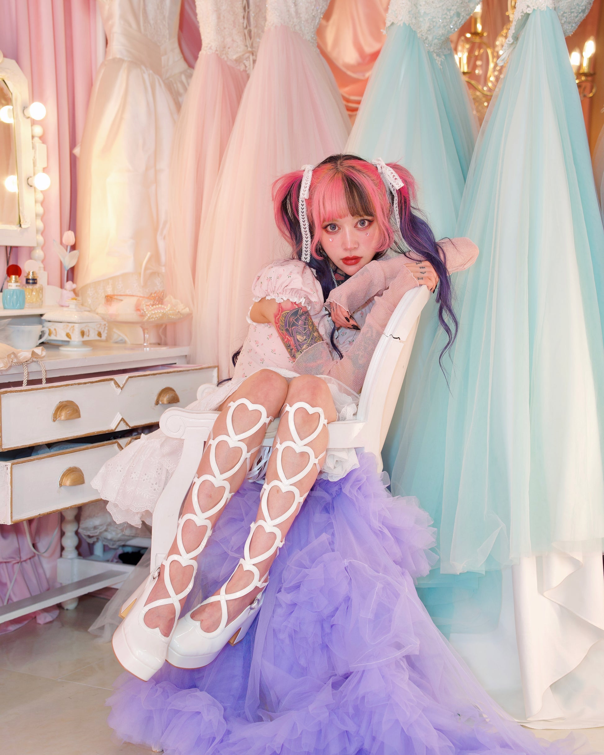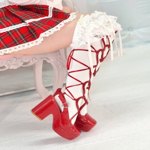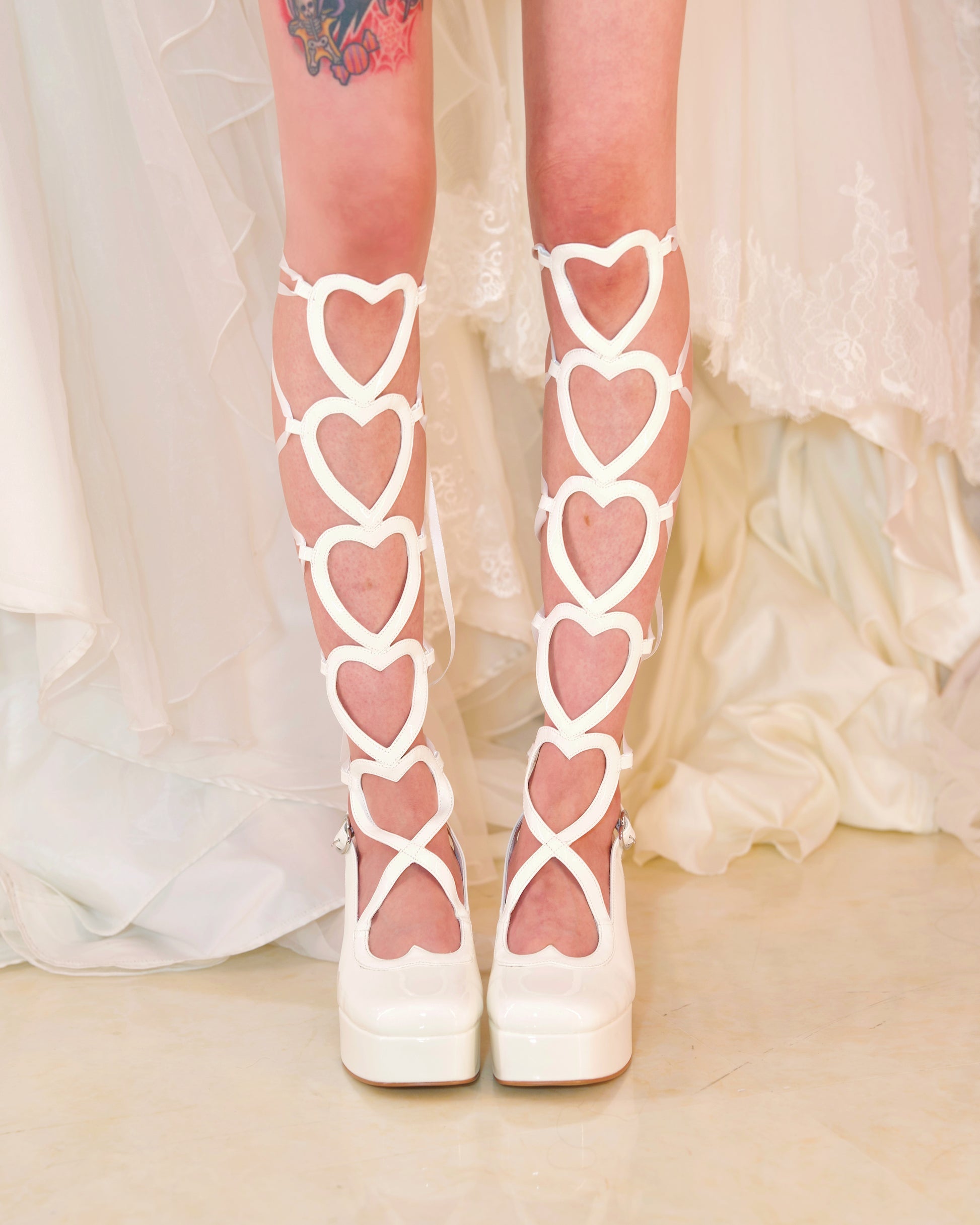 A love letter in the form of shoes. These dreamy heels feature hearts that climb up the leg all the way to the knee, laced together in the back with adjustable ribbons so you can get the perfect fit. Each heart is threaded with loops, letting the satin ribbon weave through like a corset. The final heart flips upside down and melts into the platform base, where a soft square toe and adjustable ankle strap keep things grounded. Whether you're dressing up or just feeling extra, these are made to be worn with a little drama and a lot of love.