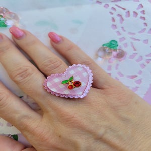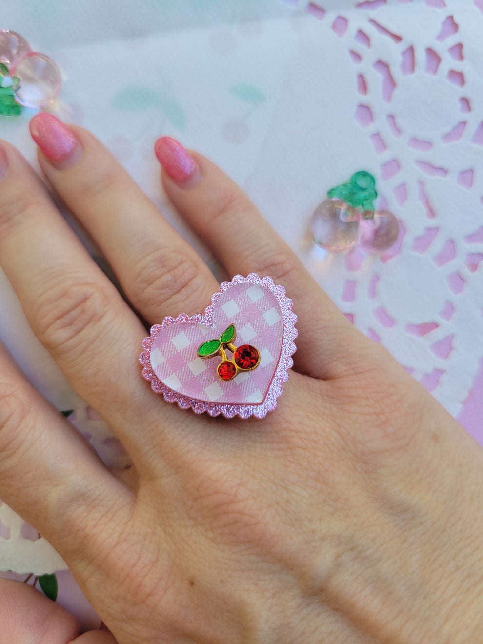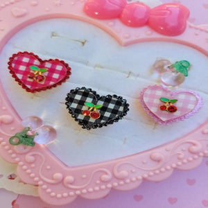 "Gingham hearts surrounded by a color coordinating scallop heart and adorned with a sparkling red cherry charm.