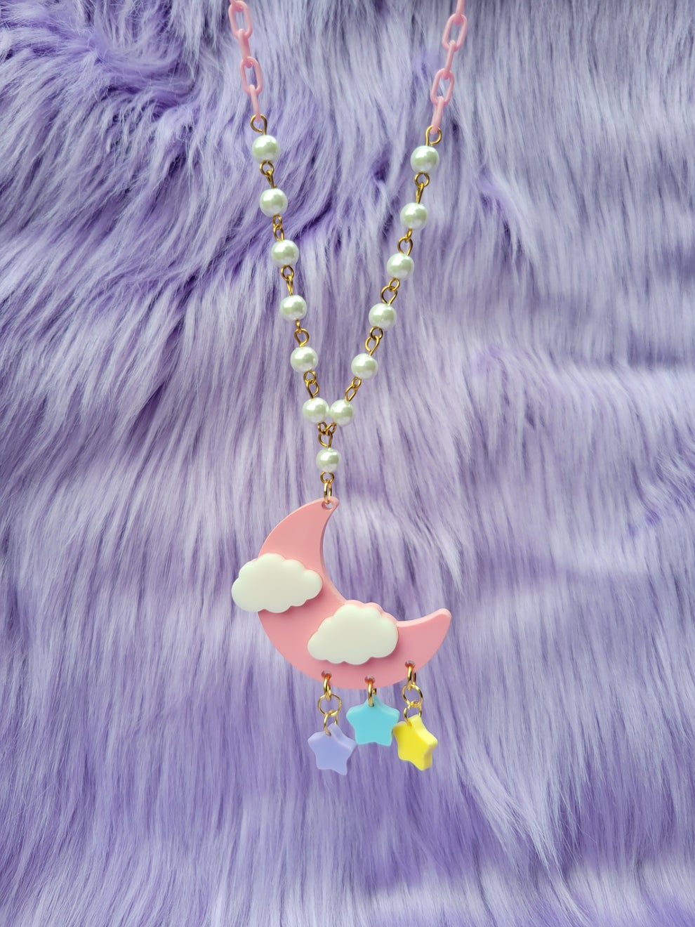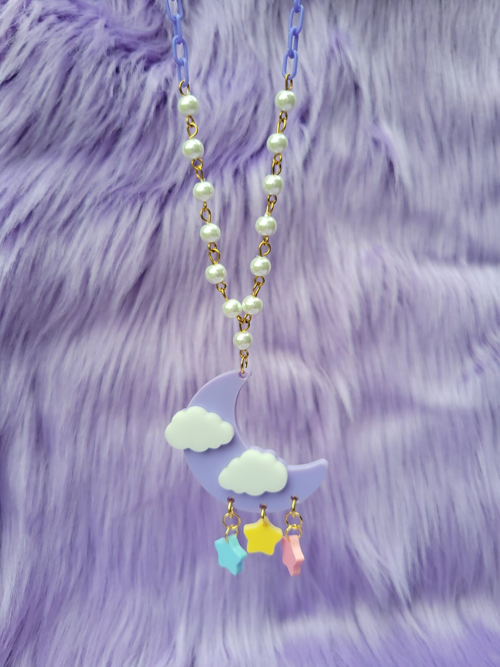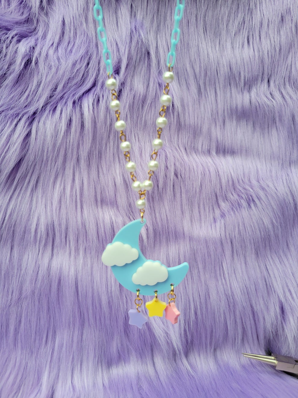 The plastic chain color matches the chosen moon color, and hand beaded pearls connect it to the dreamy moon.