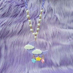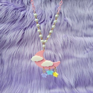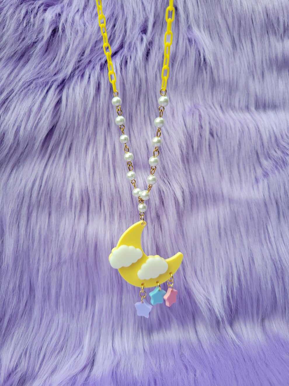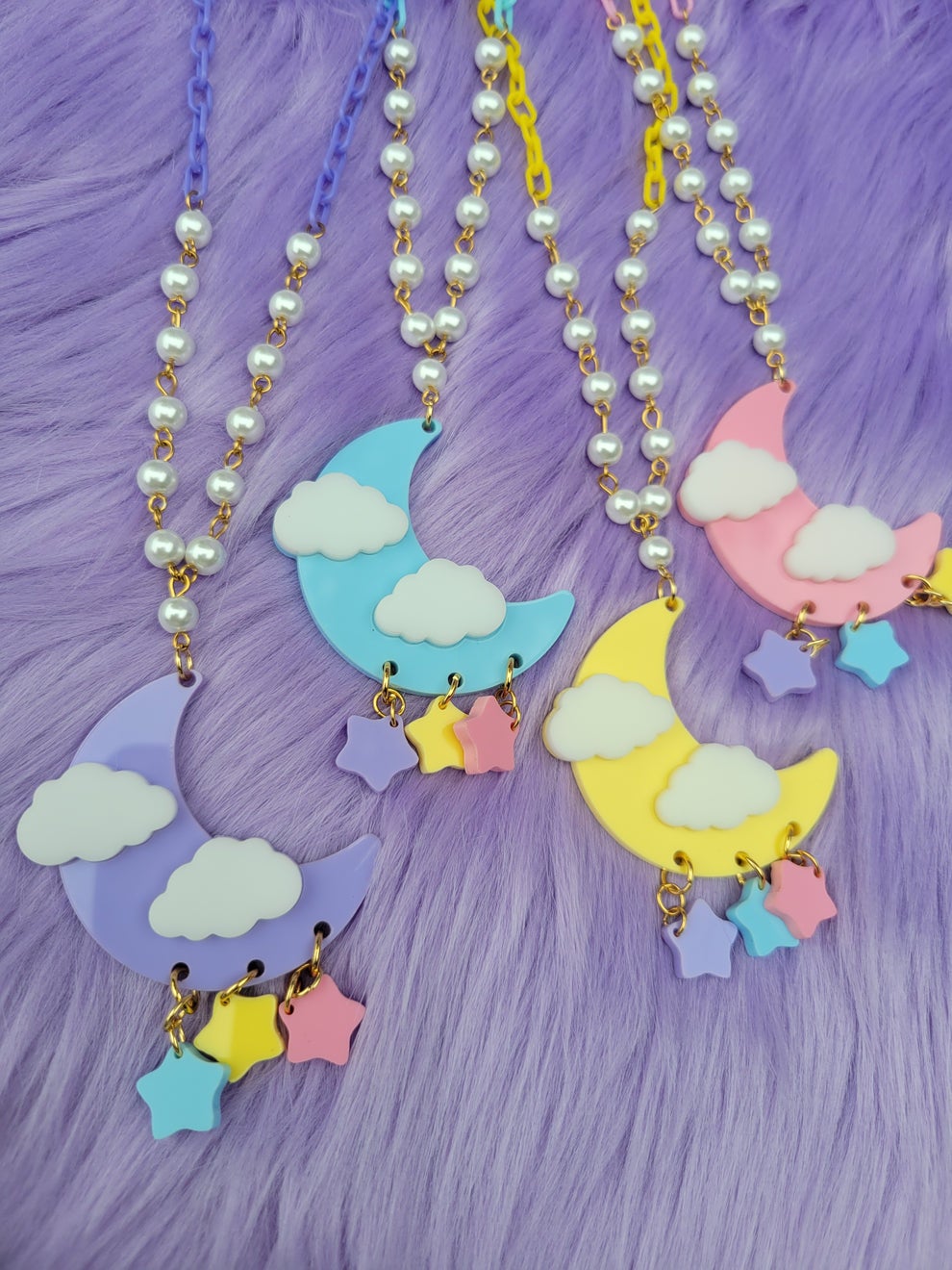 "Finally! My signature moon earrings as a necklace! This dreamy moon necklace comes in pastel pink, yellow, blue or lavender. Two matte white clouds adorn the front and three stars dangle underneath.