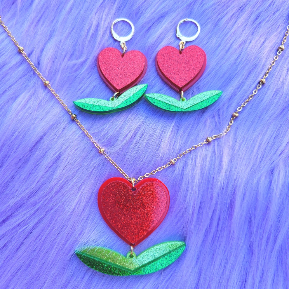 Designed, cut and assembled in house, this love core necklace is made up of layers of glittery red and green acrylic.