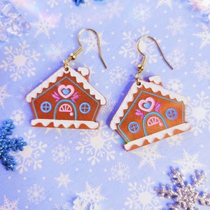 Gingerbread houses measure about 1" x 1.25" and earring is a stainless steel gold tone hook or clip on."