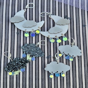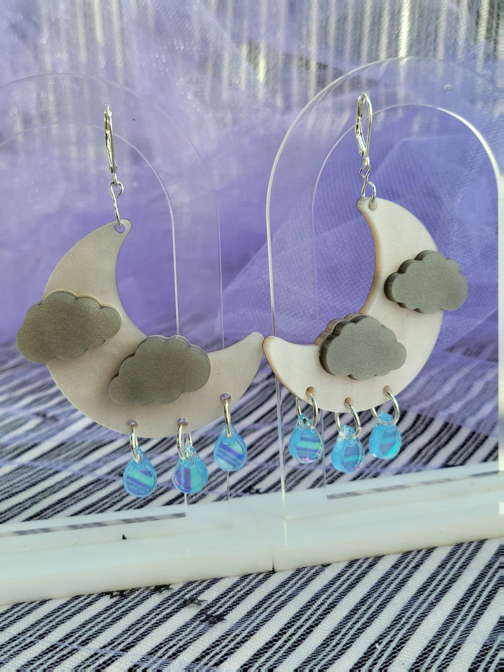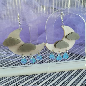 "A pair of pearly white moon earrings adorned with pearly grey rain clouds. A trio of iridescent blue raindrops hang from the bottom of the moons.