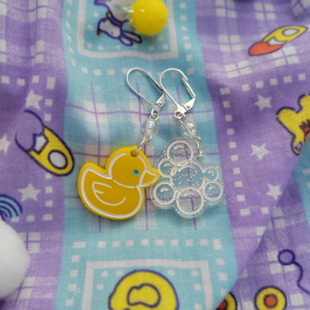 The duck and bubbles are acrylic cut in house, painted and assembled. They hang from sterling silver leverbacks or clip ons."