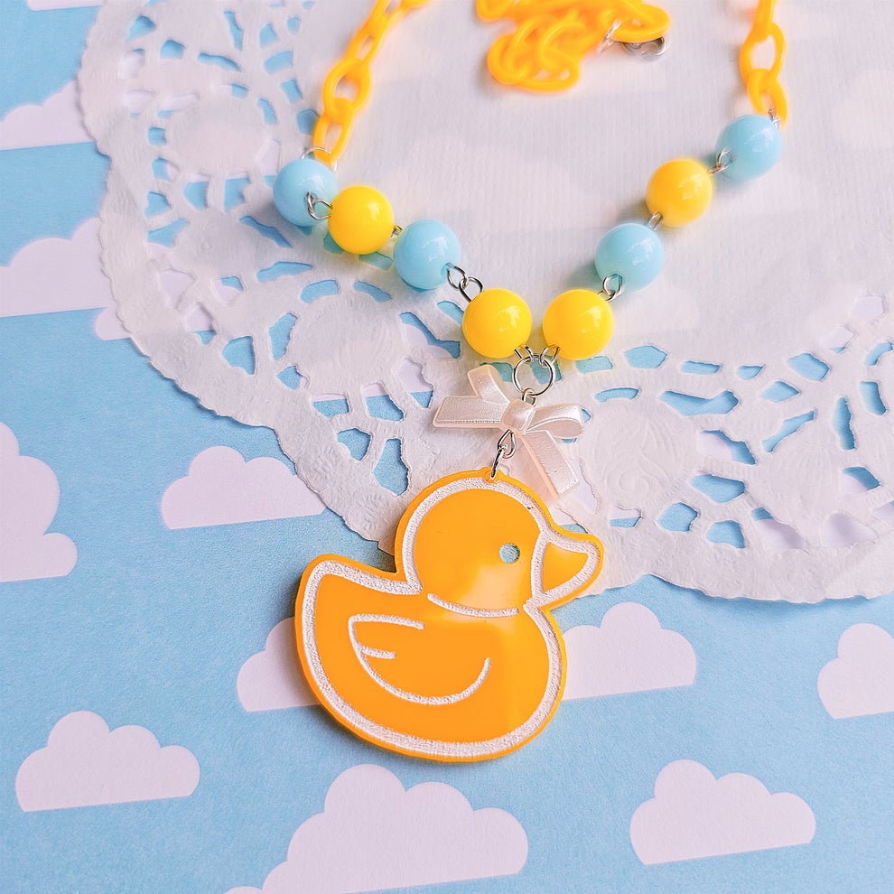 The acrylic duck is cut out of acrylic, painted and hangs from a hand beaded chain of yellow and clear crackle beads and a plastic chunky chain.