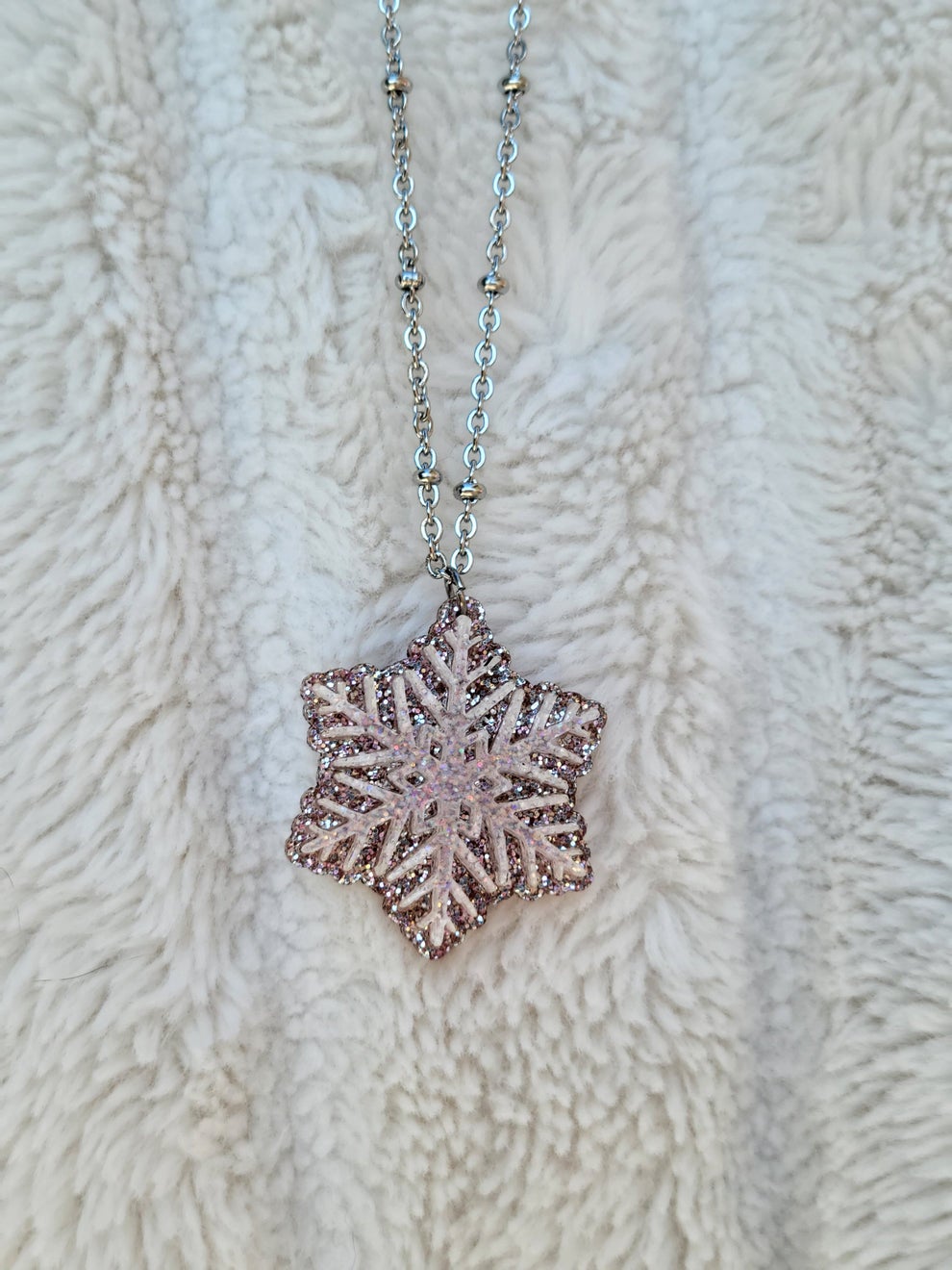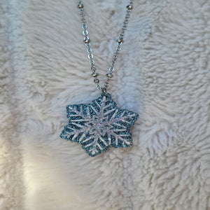 This sparkly snowflake measures about 1.25" x 1.25" and hangs from a sparkly stainless steel chain."