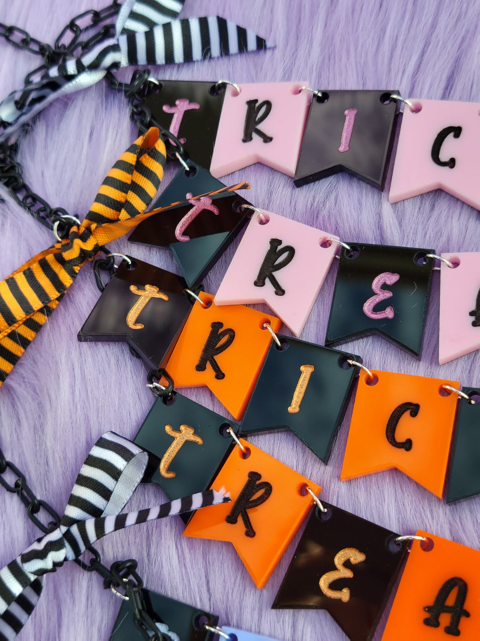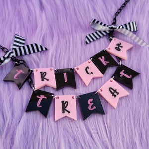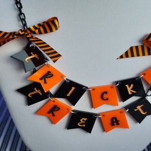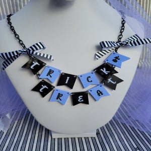 "Let everyone know you're here for the candy. This necklace spells 'Trick or Treat' in a classic black striped pattern. The letters are hand painted to match their color counterpart. Black and white (or orange) bows frame the traditional phrase on either side.