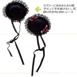 ラブリーにきめるんなら帽子だって手を抜けない。花飾り付き¥6,900、レース
