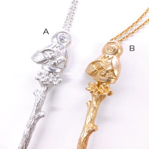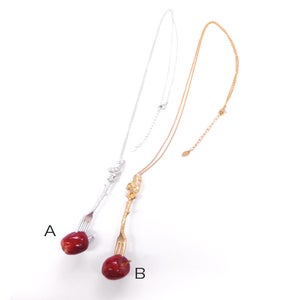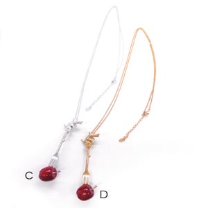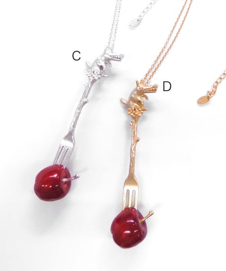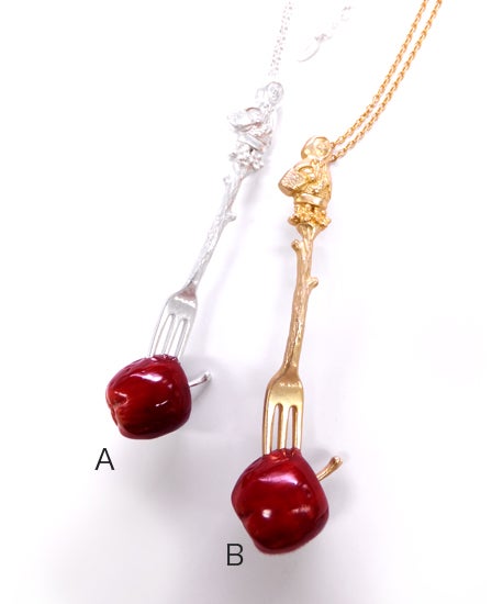 Colors: A:シャペロンルージュ×レッド×アンティークシルバー B:シャペロンルージュ×レッド×アンティークゴールド C:ウルフ×レッド×アンティークシルバー D:ウルフ×レッド×アンティークゴールド Material: Alloy, polyester, resin Size: Little Red Riding Hood, fork/apple: 2cm,5.5cm,2cm Wolf/fork/apple: 1.8cm,5.7cm,2cm Chain length: 70cm + 5cm