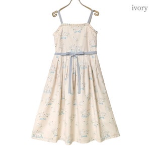 ウエストリボン取り外し可能。肩紐調節可能。後ろ一部ゴムシャーリング仕様。スカート右脇ポケット付き。