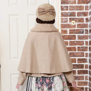 A tweed short coat with a cape and a ladylike silhouette.