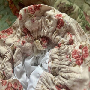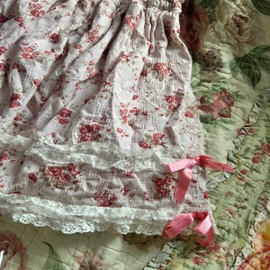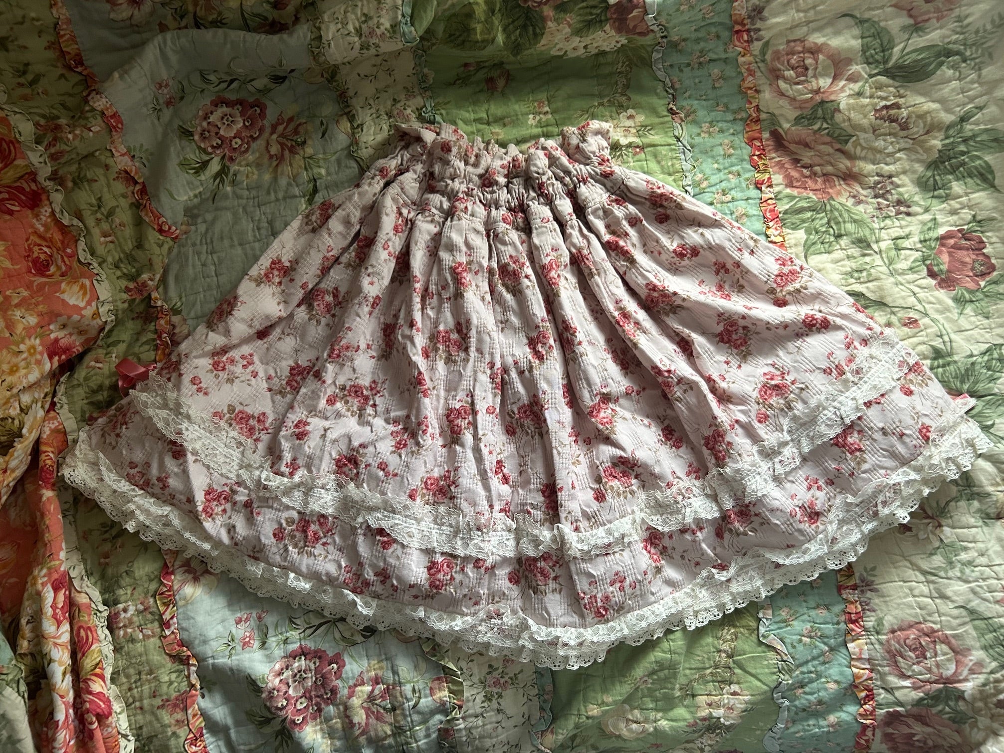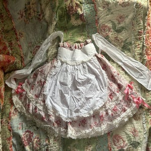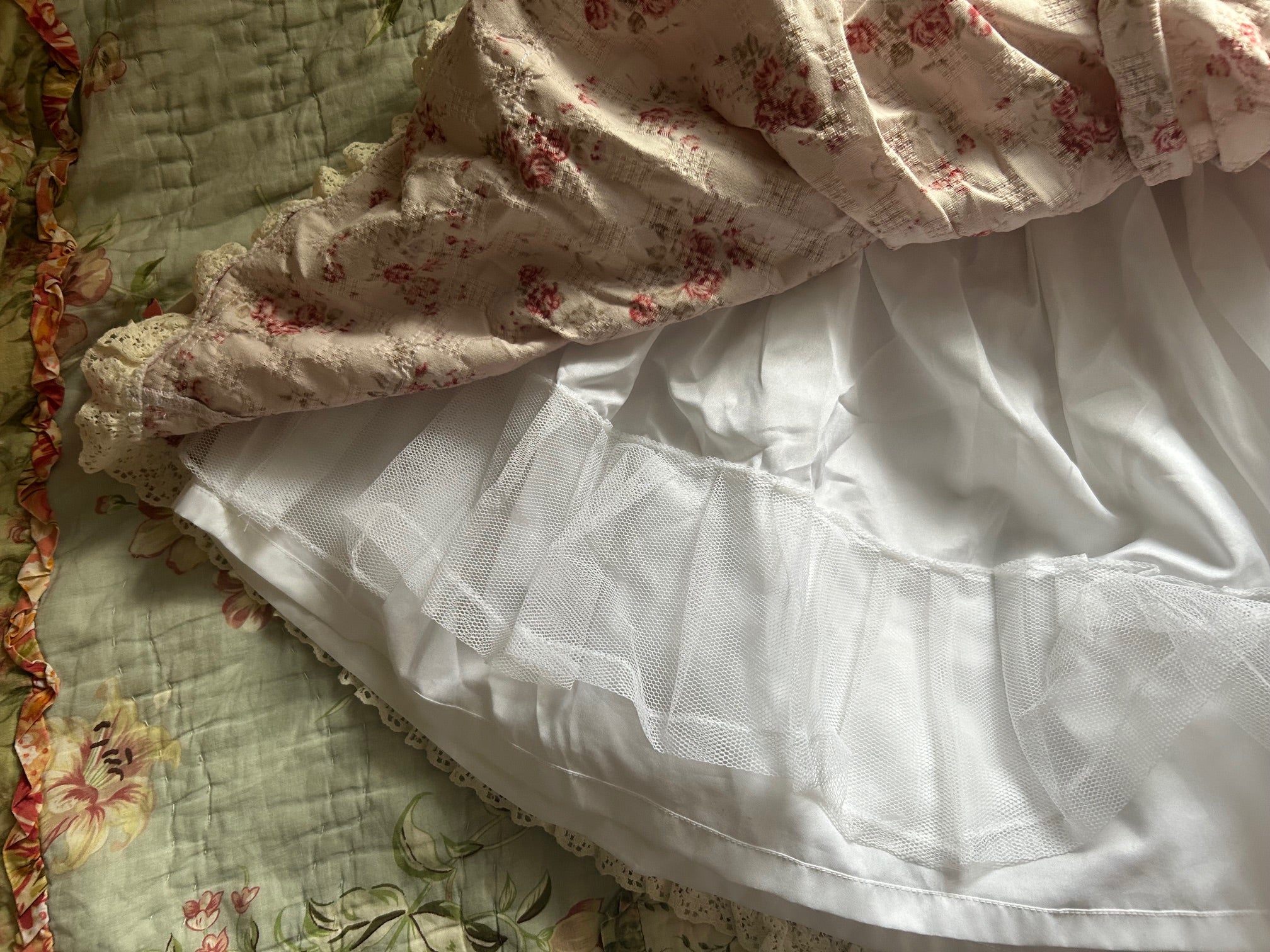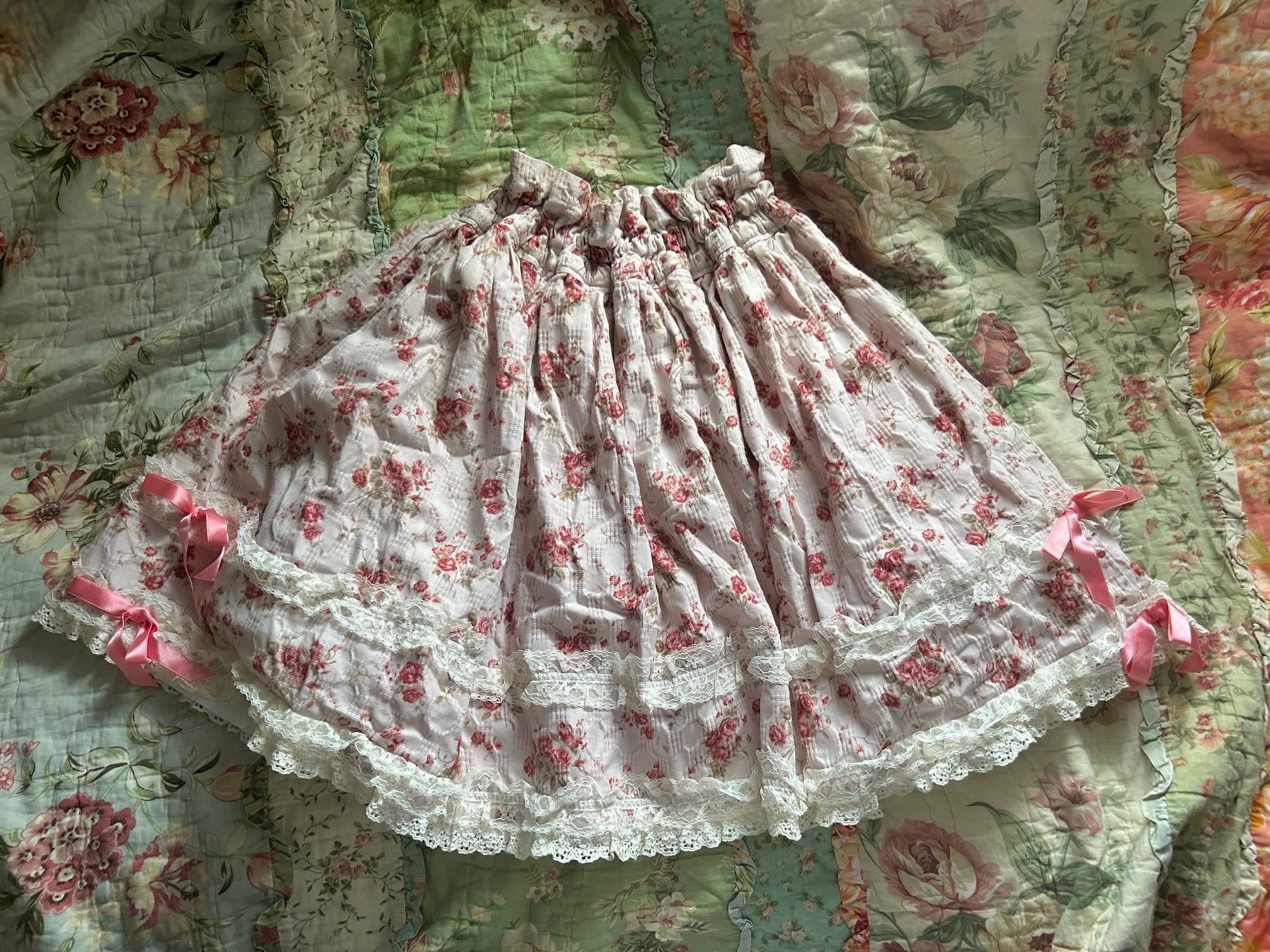 [Design notes] Skirt waistband is fully elasticized. Comes with detachable salon apron (enterer note: I believe this refers to its round shape). Has hard tulle on bottom of lining. Floral fabric has square areas of a different texture.