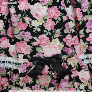 Flower printed fabric (100% cotton), torchon lace, satin ribbon, rose clear button
