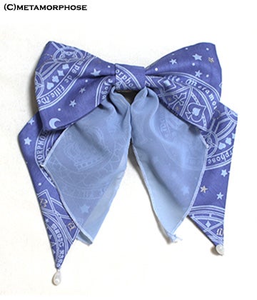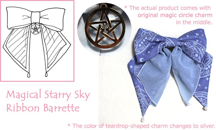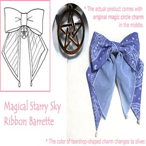 color: - black/black chiffon/gold charm - wine/bordeaux chiffon/silver charm - misty blue/saxe blue chiffon/silver charmm fabric:original Magical Starry Sky print fabric (polyester 100%), chiffon (polyester 100%), original magic circle charm, teardrop-shaped charm style:- size:- comment:Simple yet lovely! This ribbon barrette from Magical Starry Sky series is fun and girly. This makes it easy to put in any hairstyle.