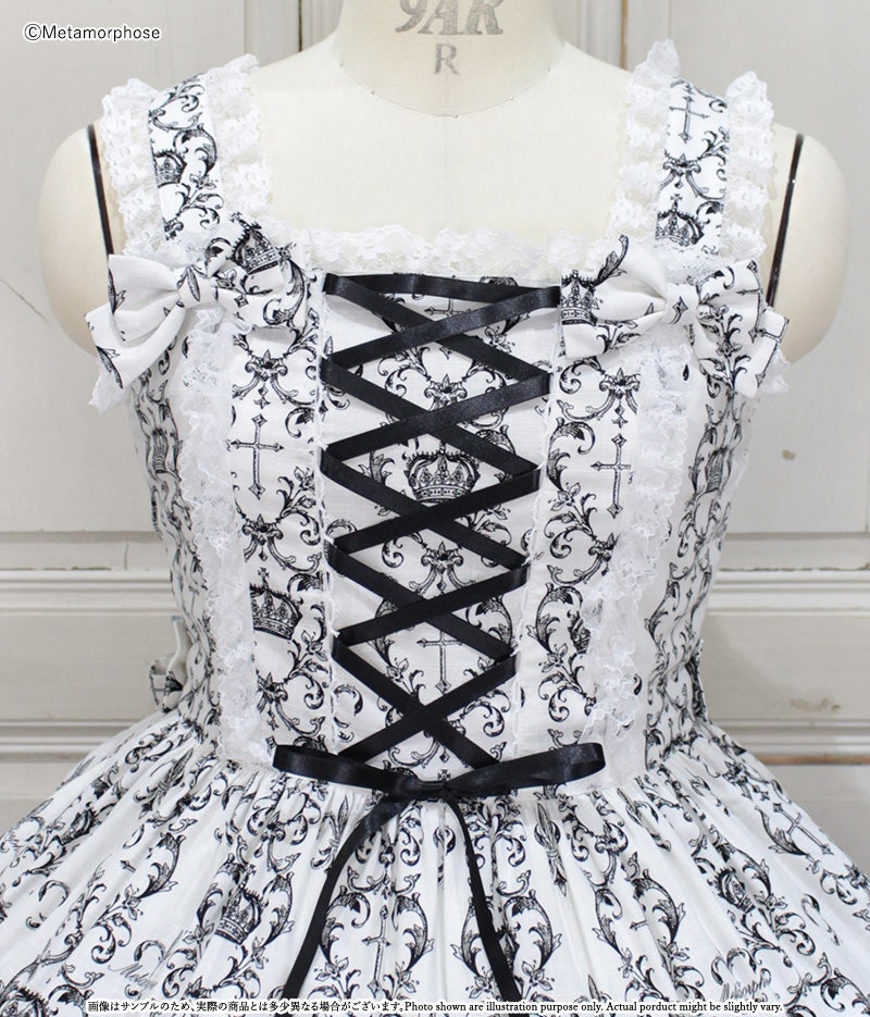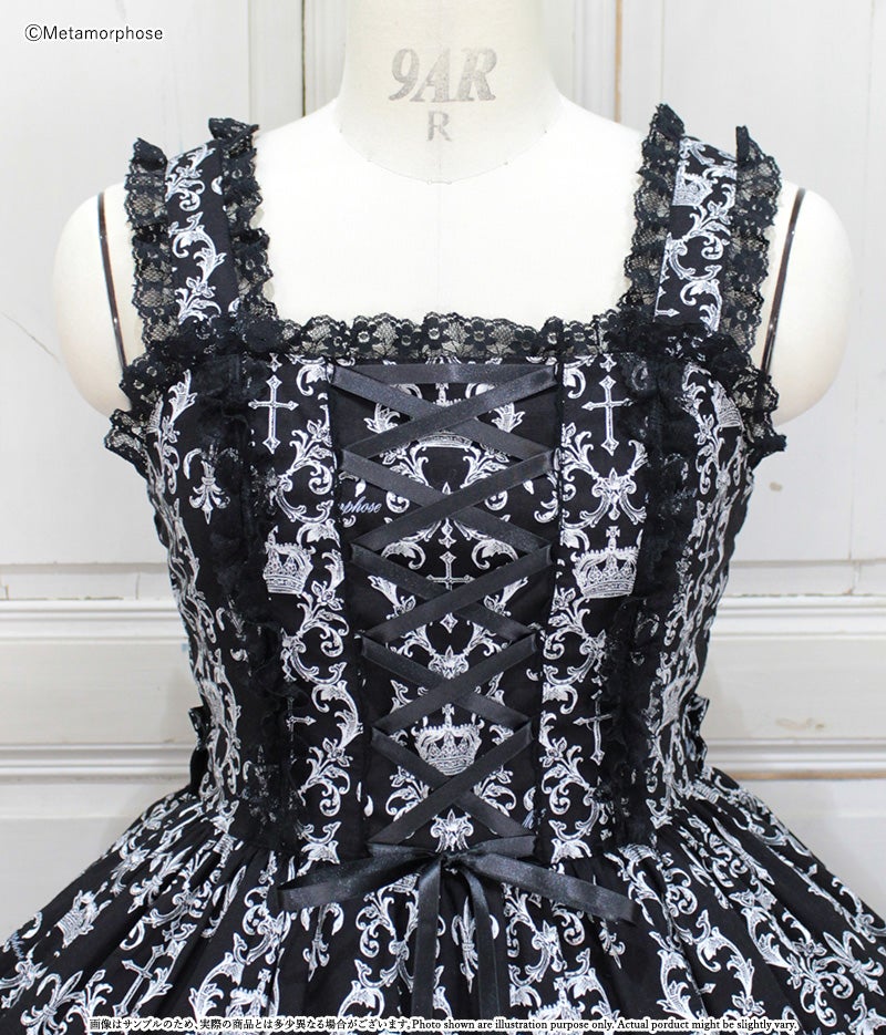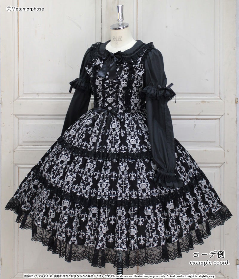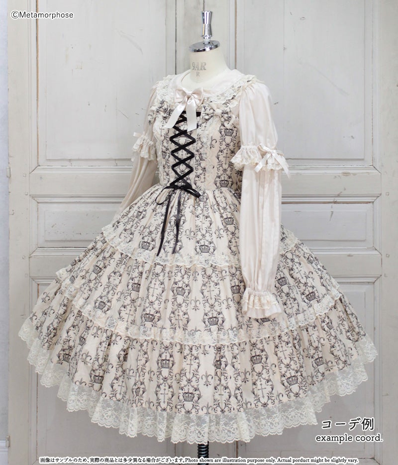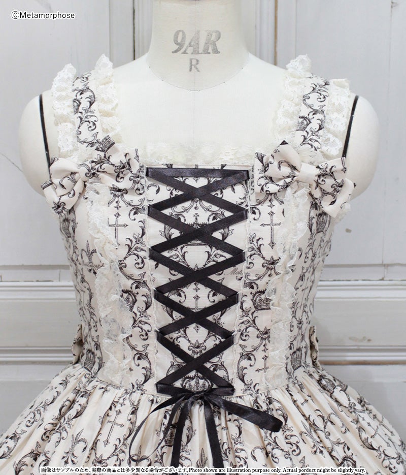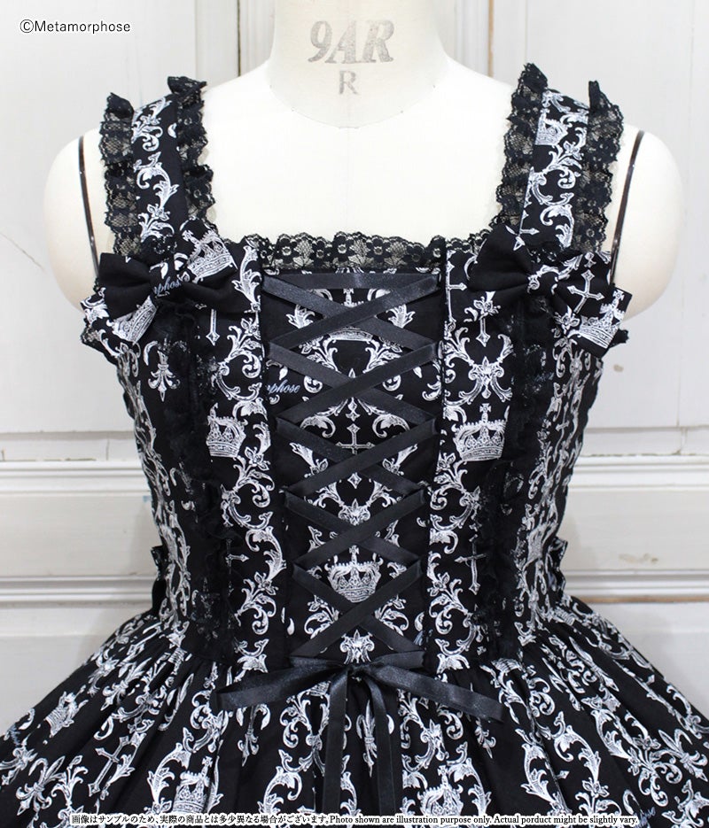 どこか懐かしいムードのプリントが長い年月を経て復刻致しました。クラウンとクロスを描いたプリントで仕立てたJSKは、ギャザーの襞が美しいティアードスカートやふんだんにあしらったレースで優雅なムードたっぷり。王道のロリータスタイルをお楽しみ下さいね。