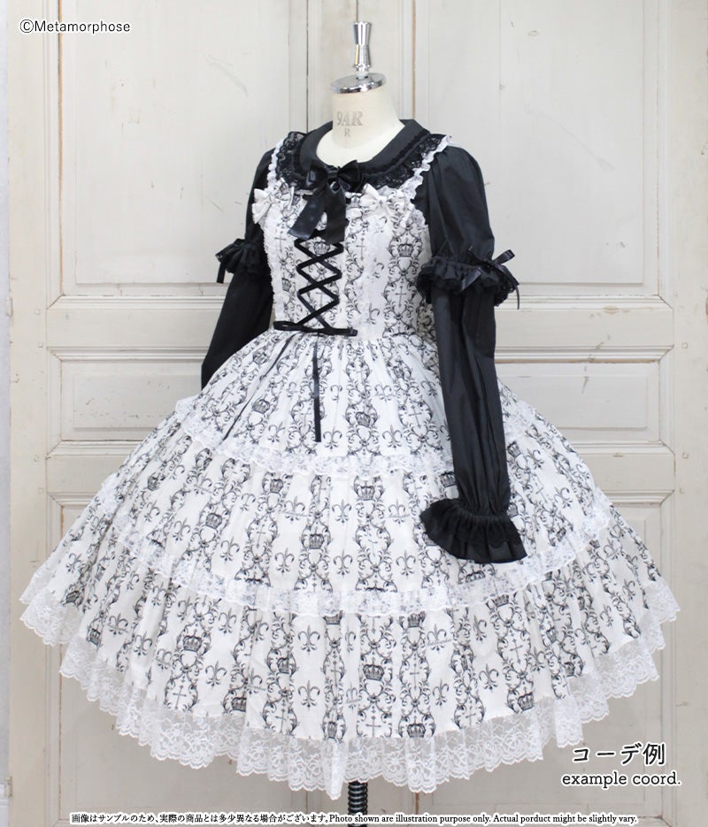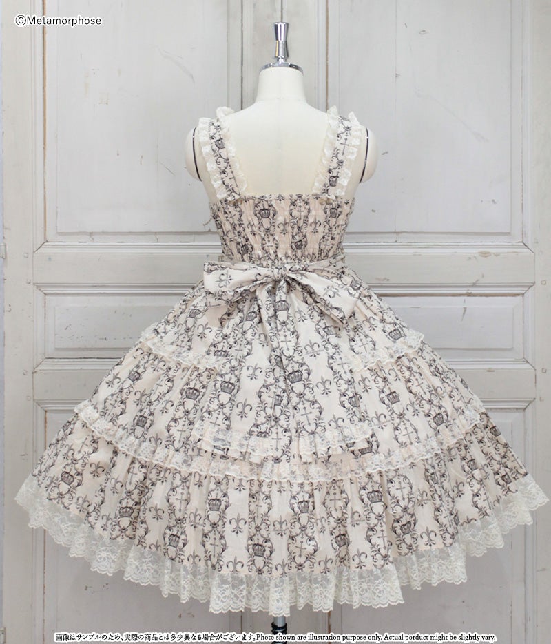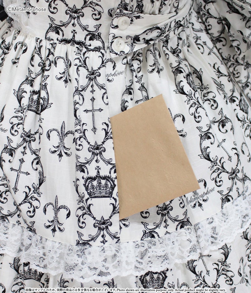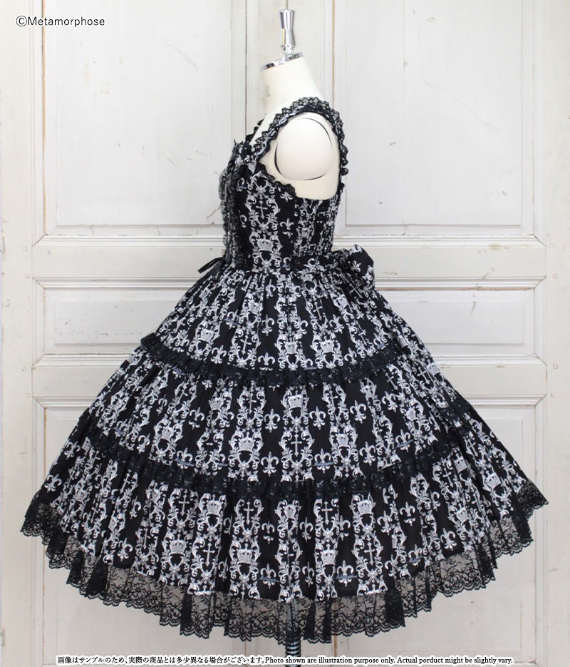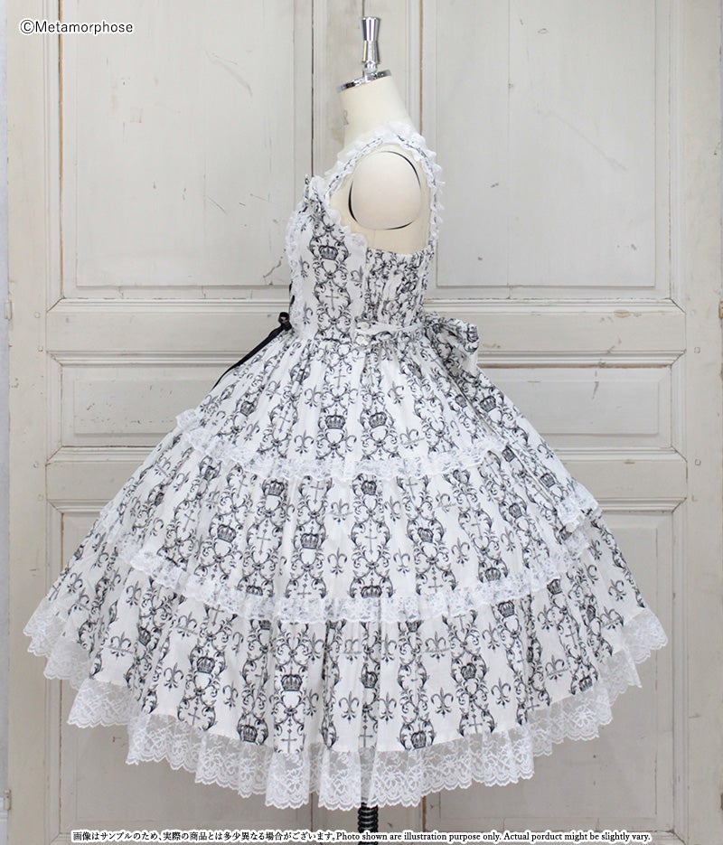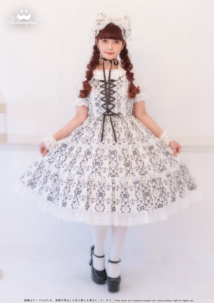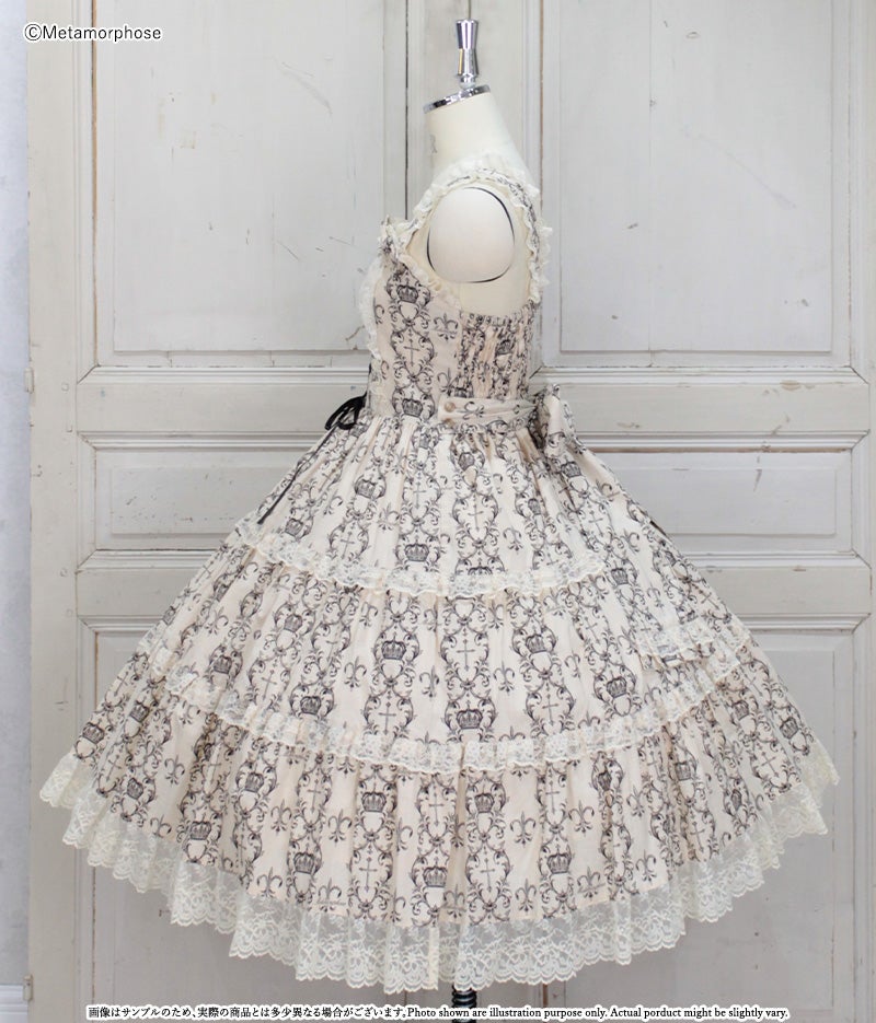 どこか懐かしいムードのプリントが長い年月を経て復刻致しました。クラウンとクロスを描いたプリントで仕立てたJSKは、ギャザーの襞が美しいティアードスカートやふんだんにあしらったレースで優雅なムードたっぷり。王道のロリータスタイルをお楽しみ下さいね。