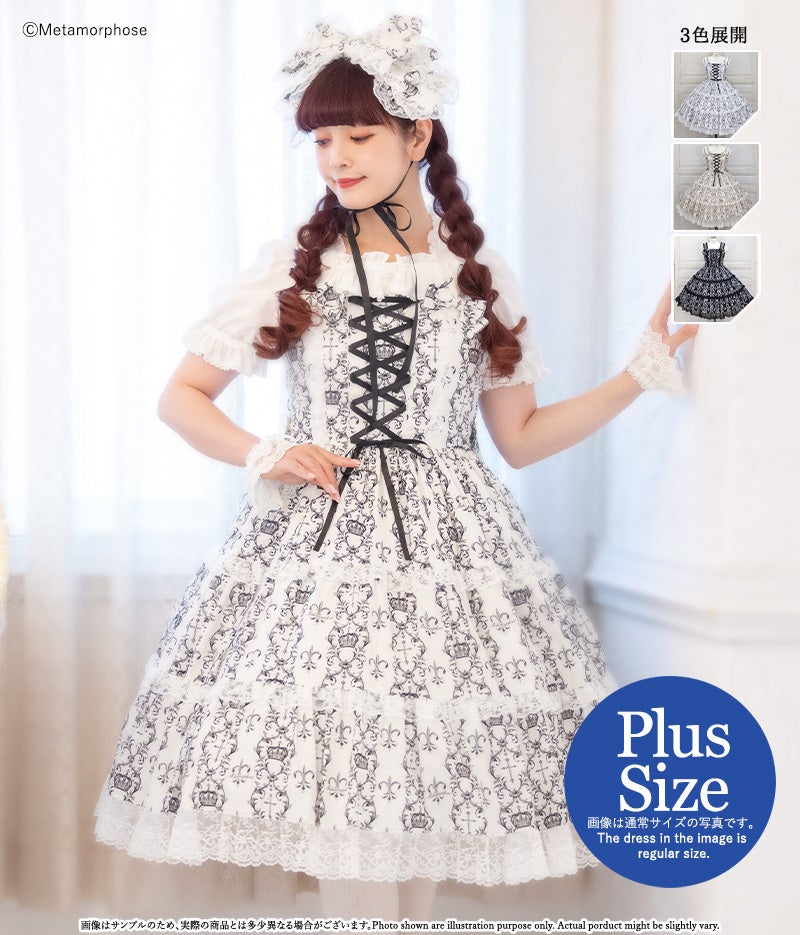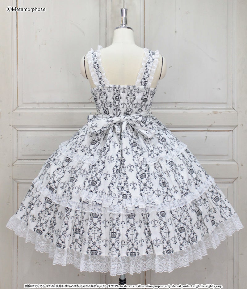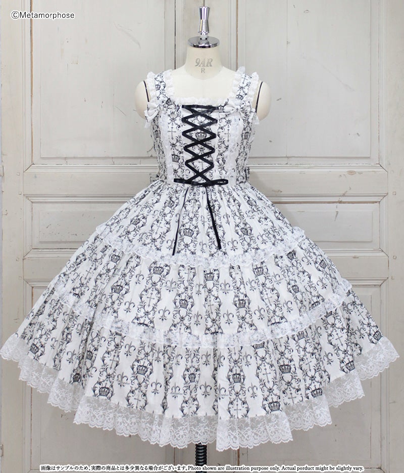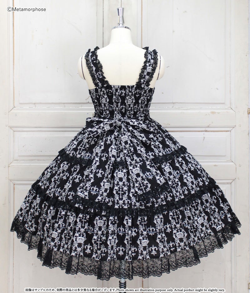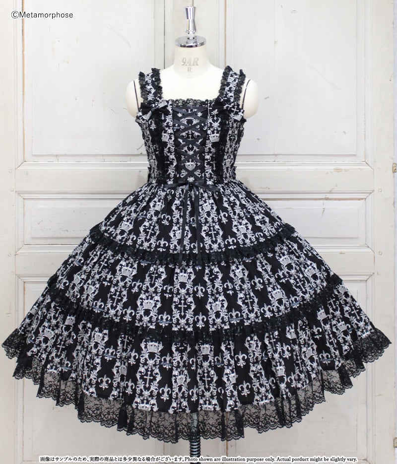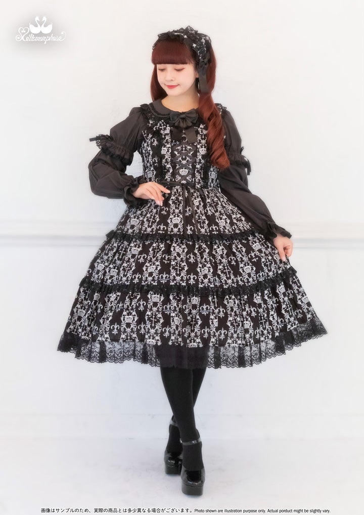 どこか懐かしいムードのプリントが長い年月を経て復刻致しました。クラウンとクロスを描いたプリントで仕立てたJSKは、ギャザーの襞が美しいティアードスカートやふんだんにあしらったレースで優雅なムードたっぷり。王道のロリータスタイルをお楽しみ下さいね。