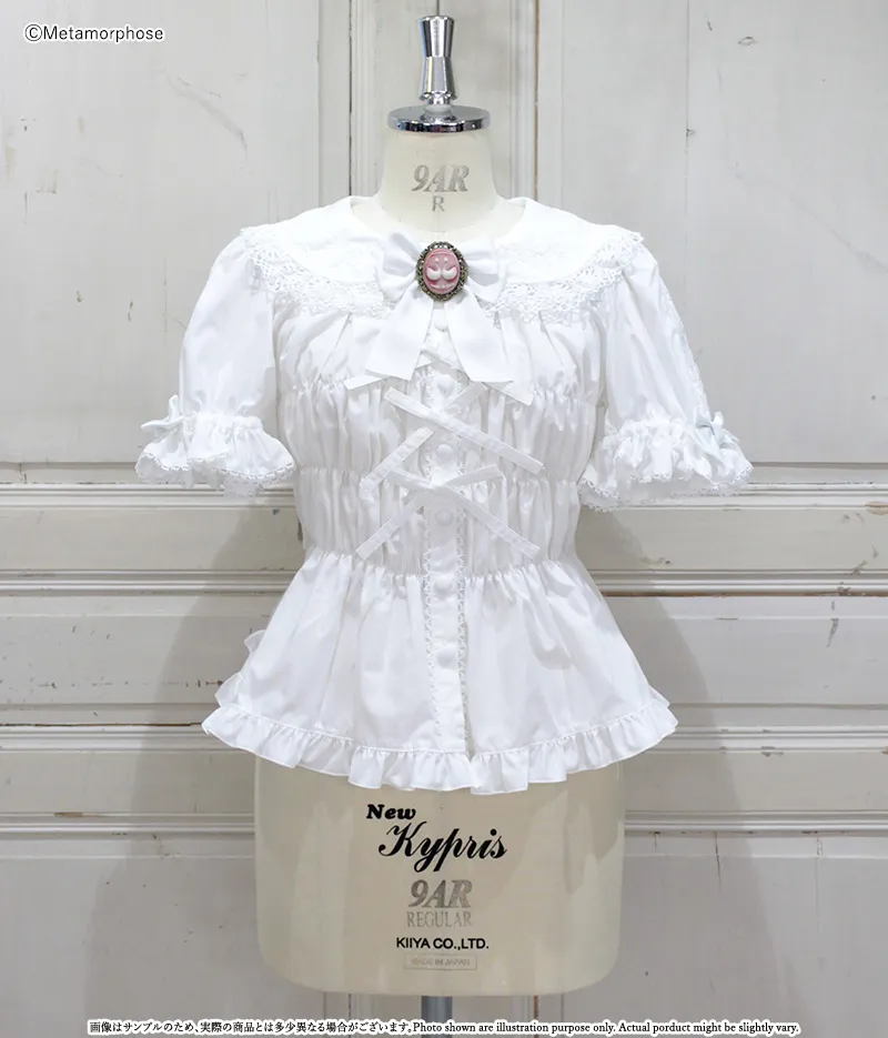 The ribbon threaded through the ladder lace is beautiful♪ This blouse is made with a generous amount of wide torchon lace. It comes with an original swan cameo brooch, so you can enjoy attaching and detaching it as you like♪