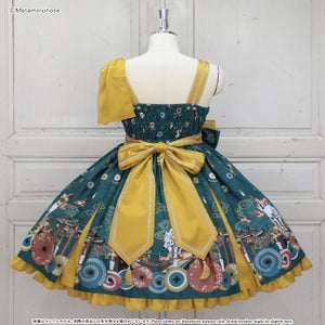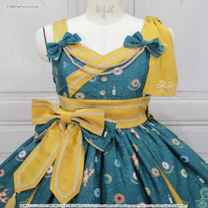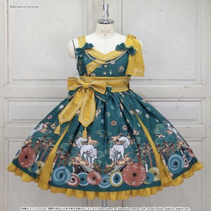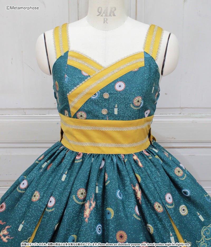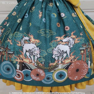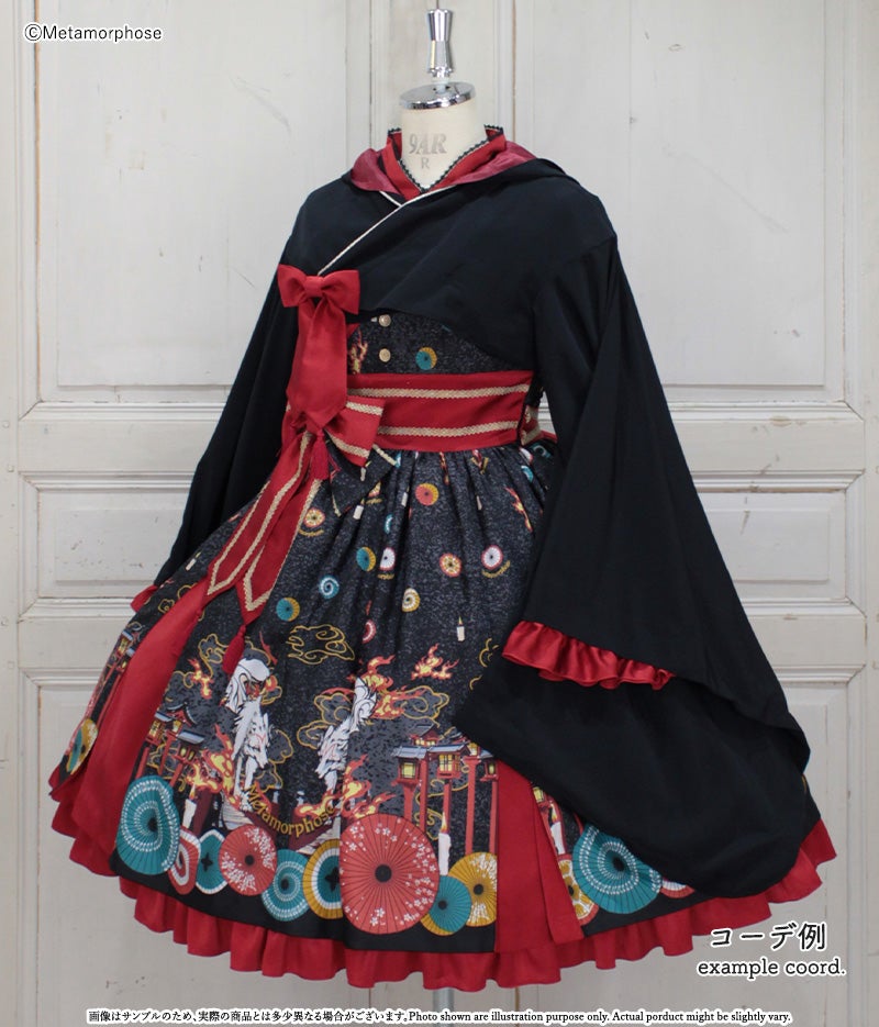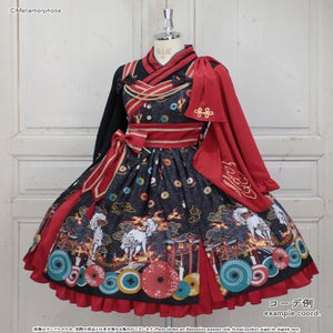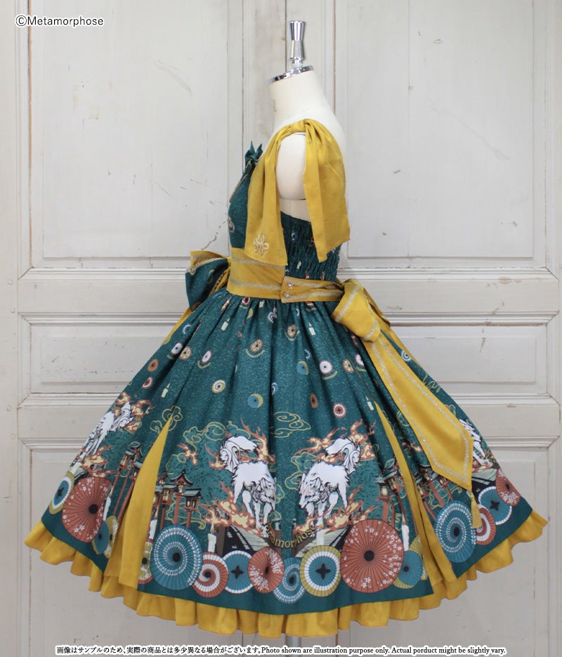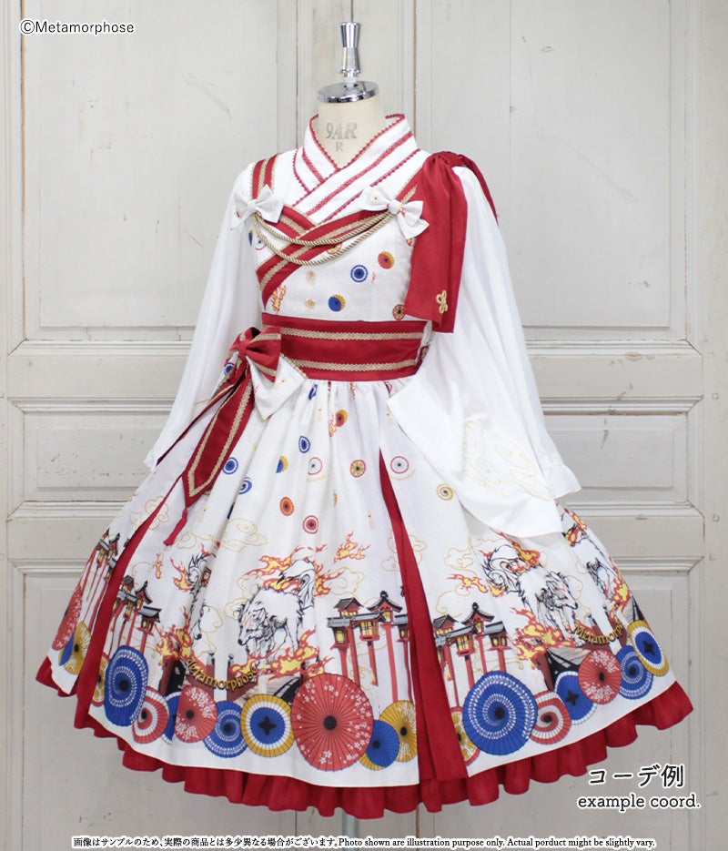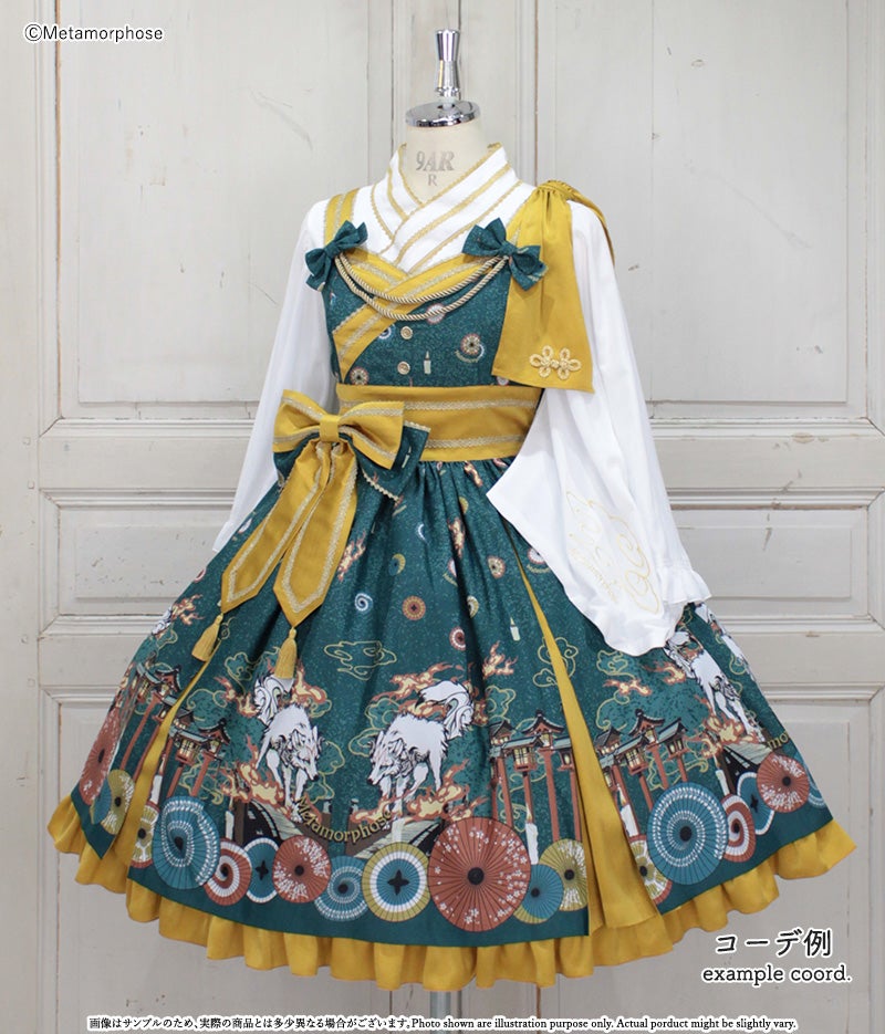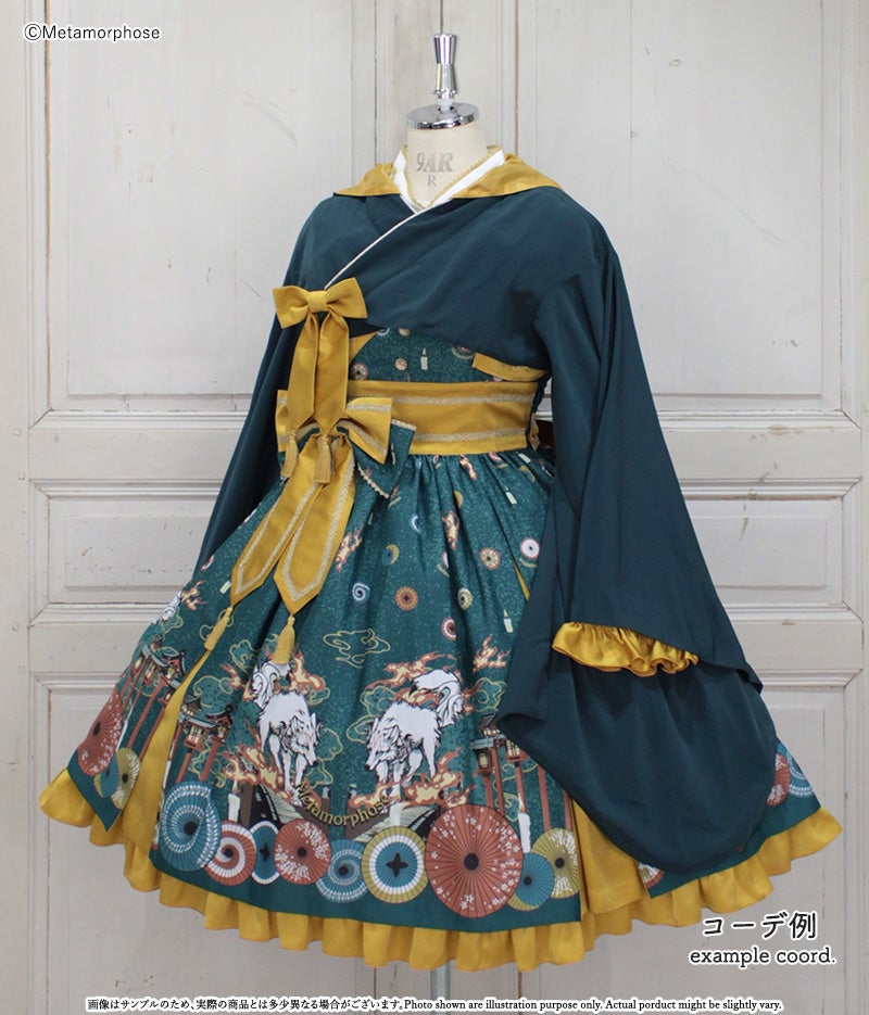 暁の頃に浮かぶのは対の狼と灯火たち、その姿は夢かまぼろしか…物語が始まりそうな神秘的なシーンを描いたJSKは合わせ風の胸元や帯のような大きなリボンで和のムードたっぷり。肩のフリルやリボンブローチなど、着こなしの楽しみが広がるパーツ付でコーデに合わせて様々な表情を楽しんで頂けます。