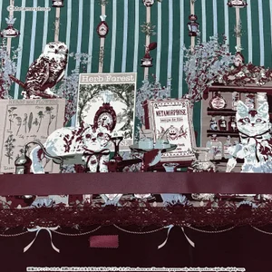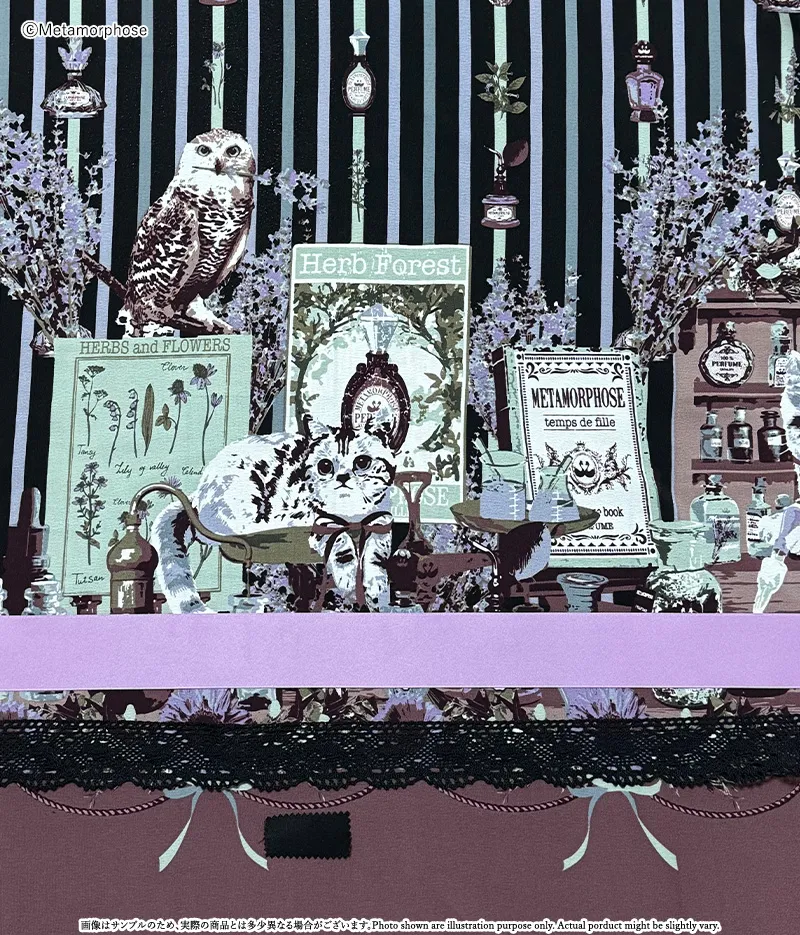 original "Secret Perfume Lab" printed fabric (100% polyester), peach faille (100% polyester), torchon lace, satin ribbon