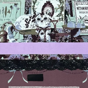 original "Secret Perfume Lab" printed fabric (100% polyester), peach faille (100% polyester), torchon lace, satin ribbon