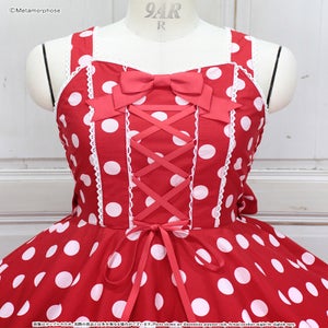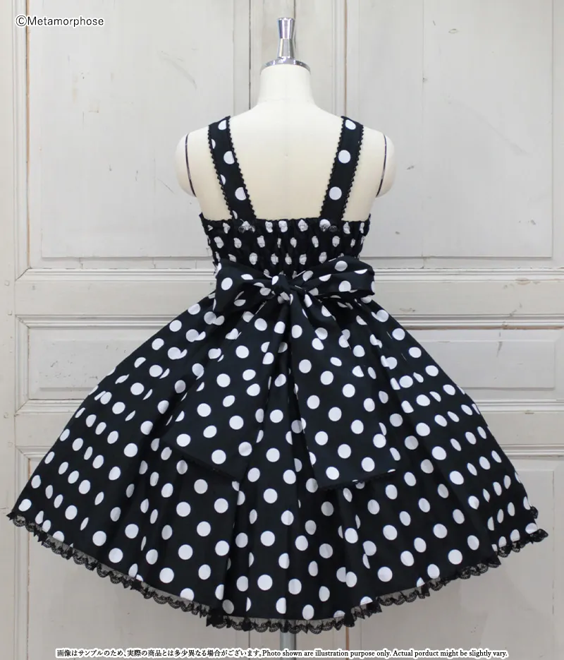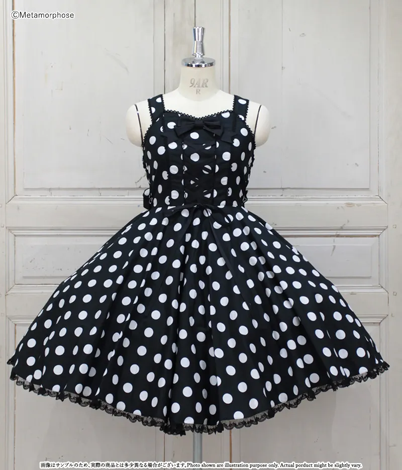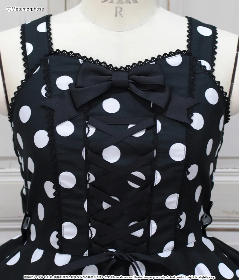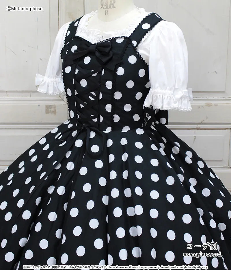 The polka dot pattern is just like syrup ♡ The ribbon on the chest and the lace-up design give this JSK a sweet look.The softly flared circular skirt is also lovely!