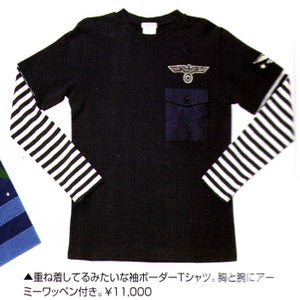 Item description: "A striped sleeve T-shirt that looks like it's layered. It has army patches on the chest and arms. ¥11,000"