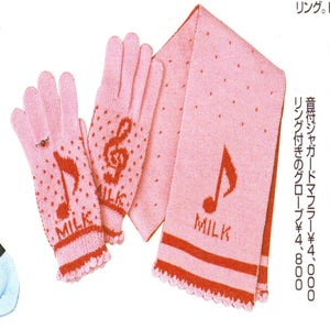 Item description: "↑These lovely pink and white gloves feature a musical note pattern and are unique to MILK. A meaningful ring sparkles on the ring finger of her left hand. ¥4800"