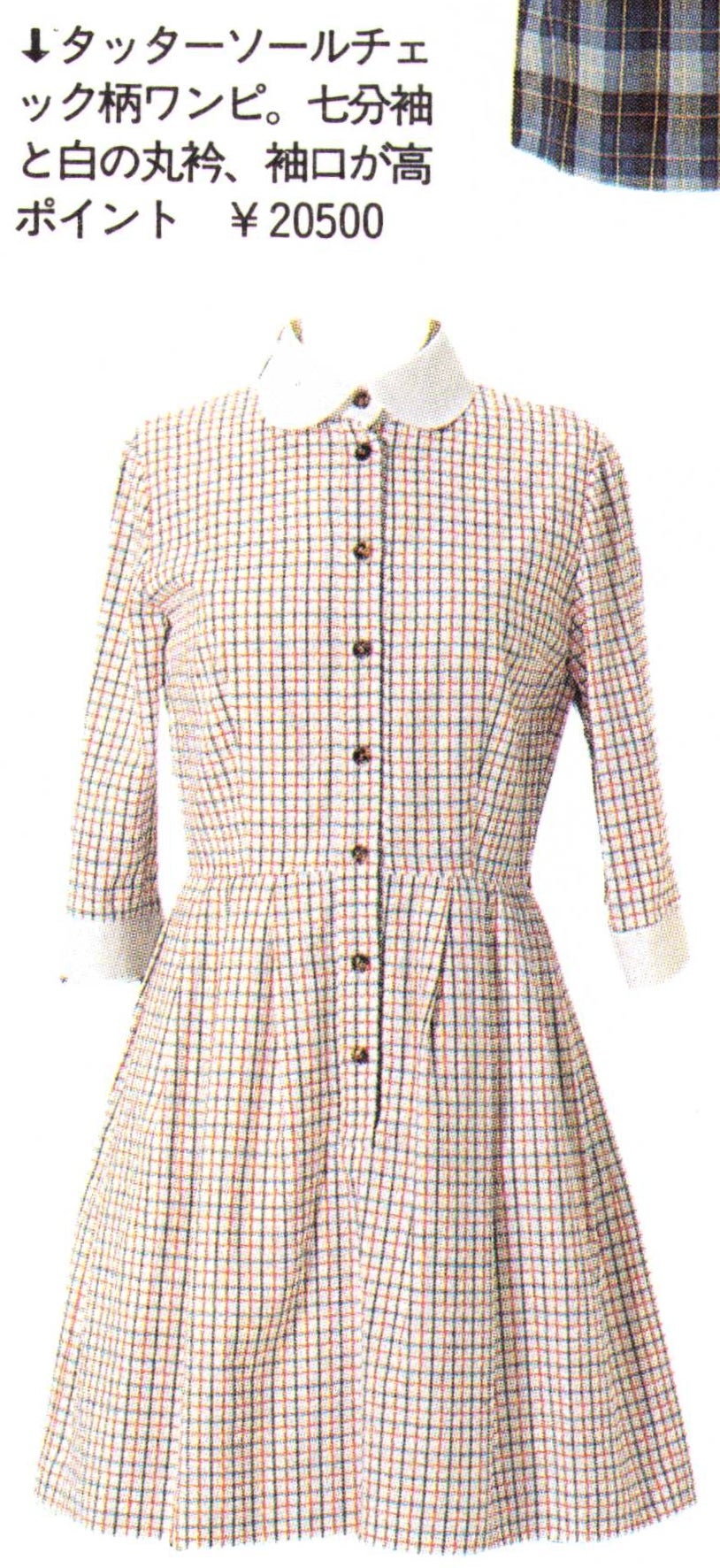 Item description: "↓Tattersall check pattern dress. 3/4 sleeves, white round collar, high cuffs. ¥20,500"