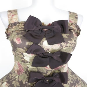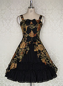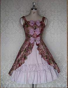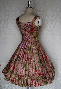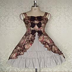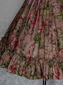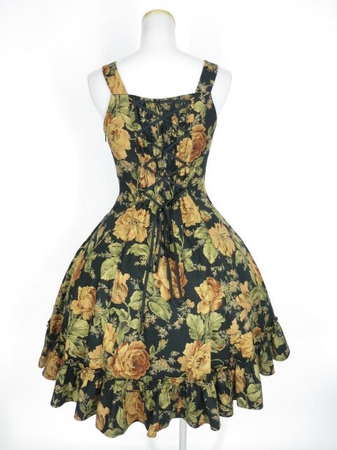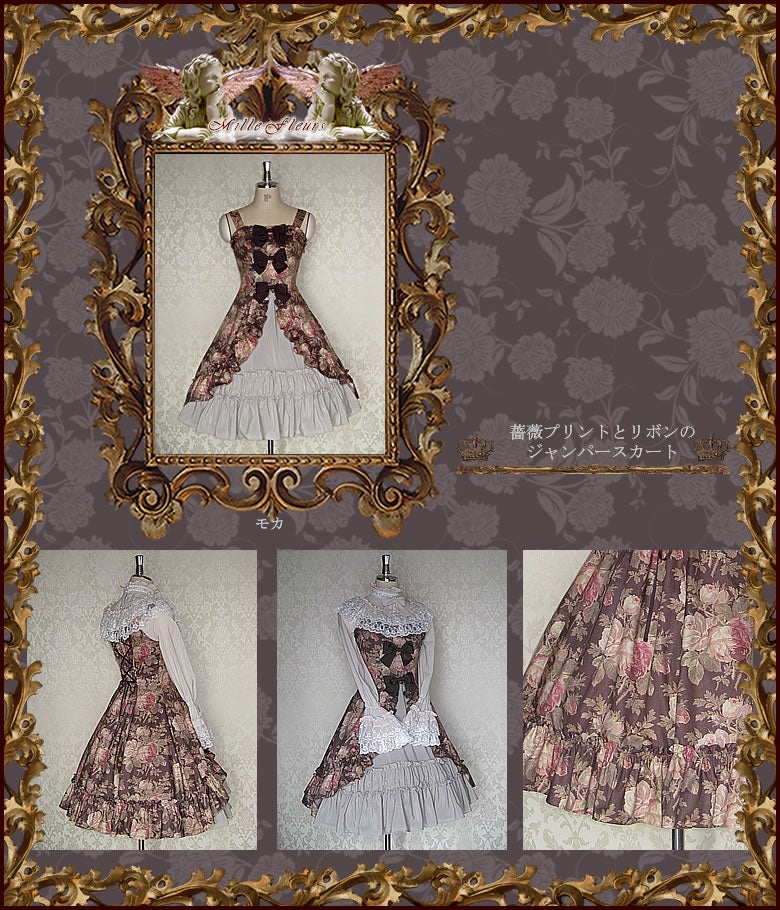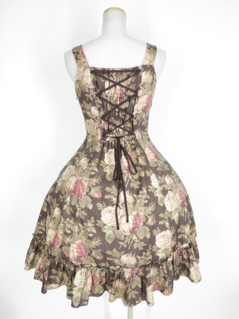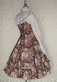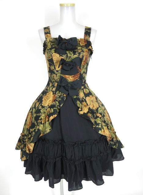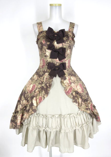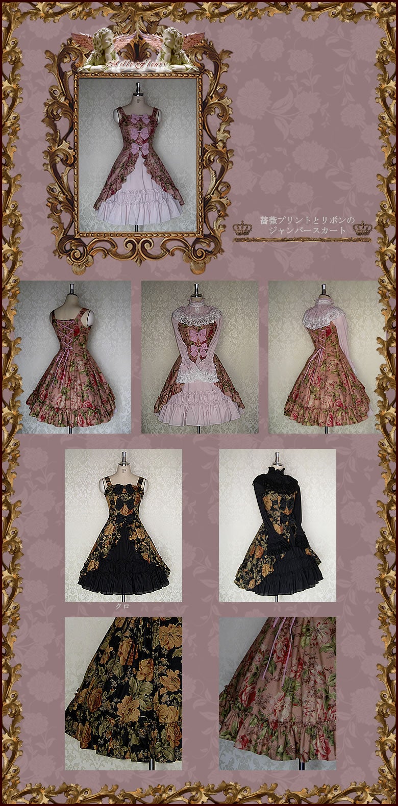 A classic and lovely jumper skirt with three removable ribbons, with an underskirt peeked out from the frills of the skirt in full bloom. You can adjust the size by shirring the back and lace-up."