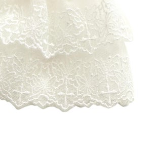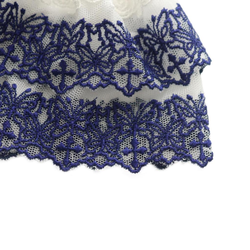 Tulle lace base fabric: 100% nylon | Embroidery upper thread: 100% rayon | Embroidery bobbin thread: 100% cotton | Ribbon: 100% polyester | Rose lace: 100% rayon