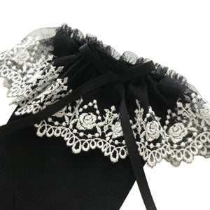 Socks: 70% Cotton, 30% nylon | Lace fabric: 100% nylon | Embroidery upper thread: 100% rayon | Embroidery bobbin thread: 100% cotton | Ribbon: 100% polyester