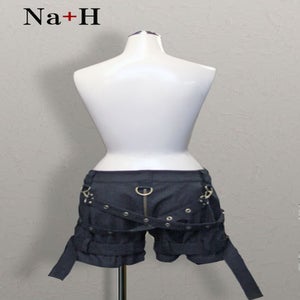 These cute, rounded balloon pants are made from a firm cotton material. The two belts, accented with eyelets, are removable. Elastic is inserted under the belts at the hem, creating a tightly cinched hem.
