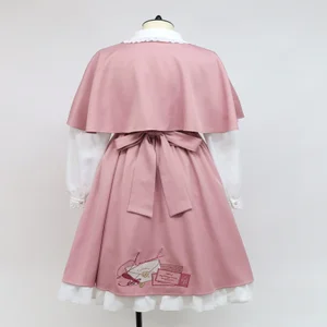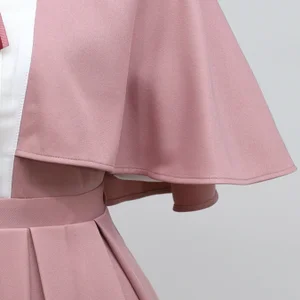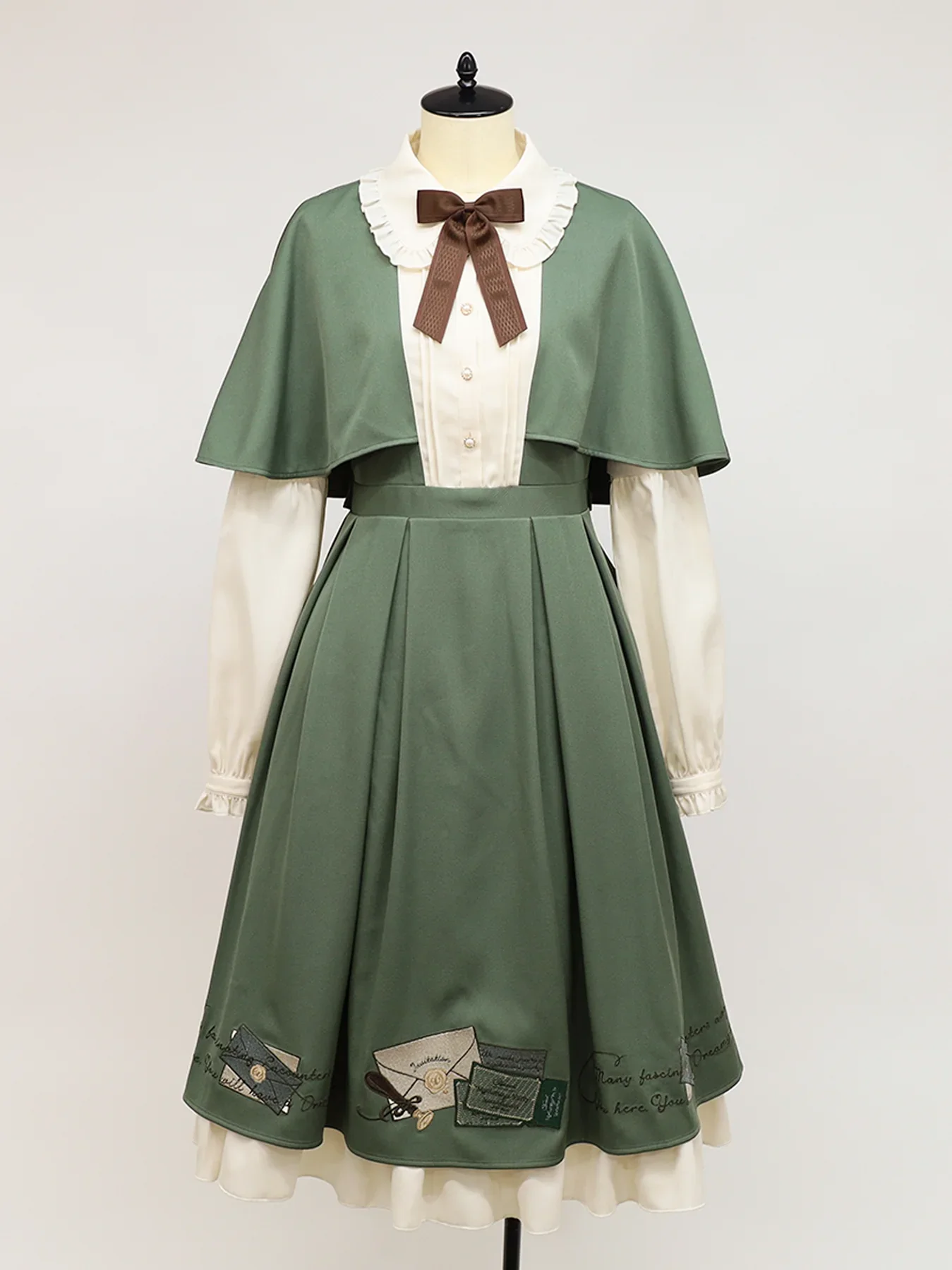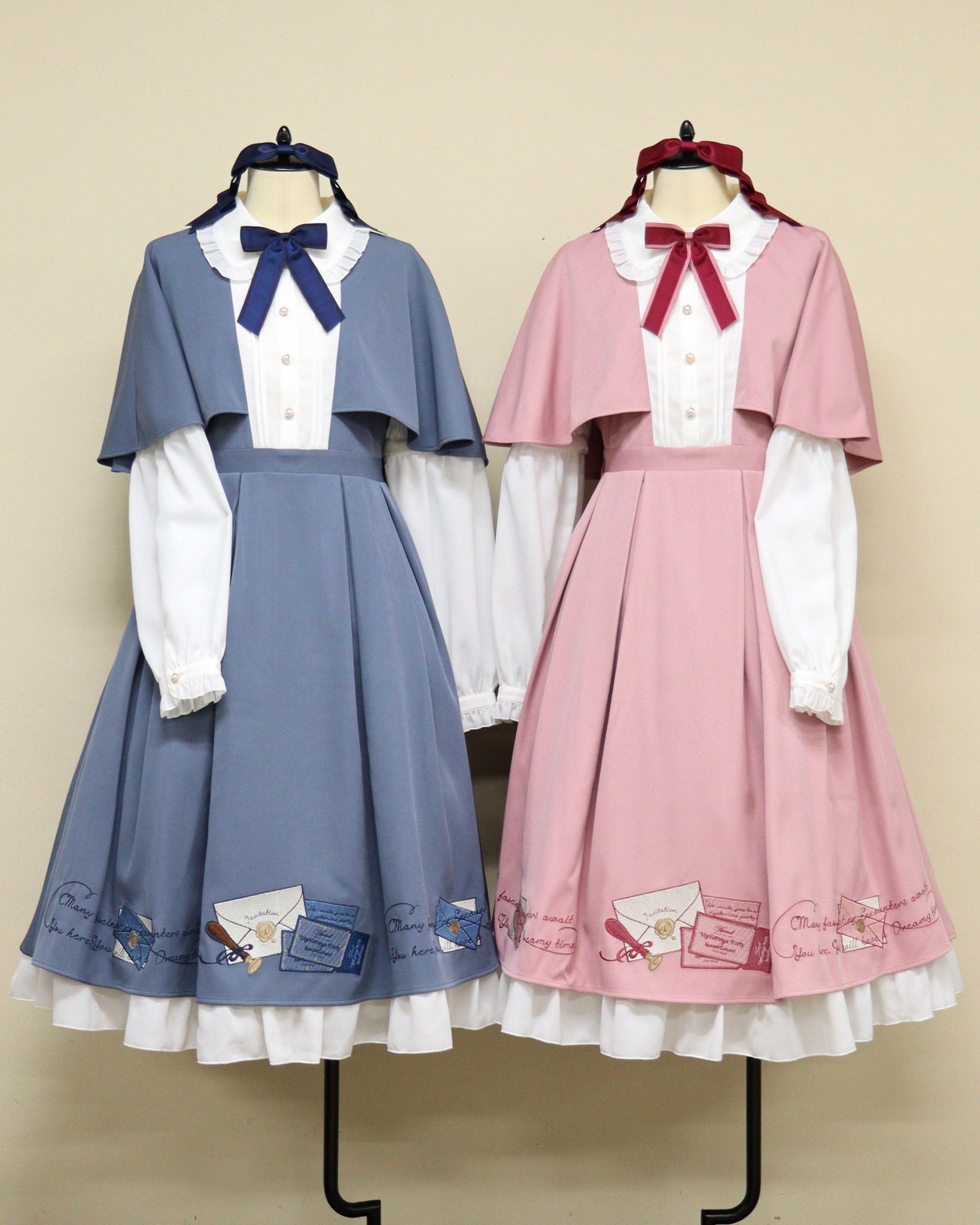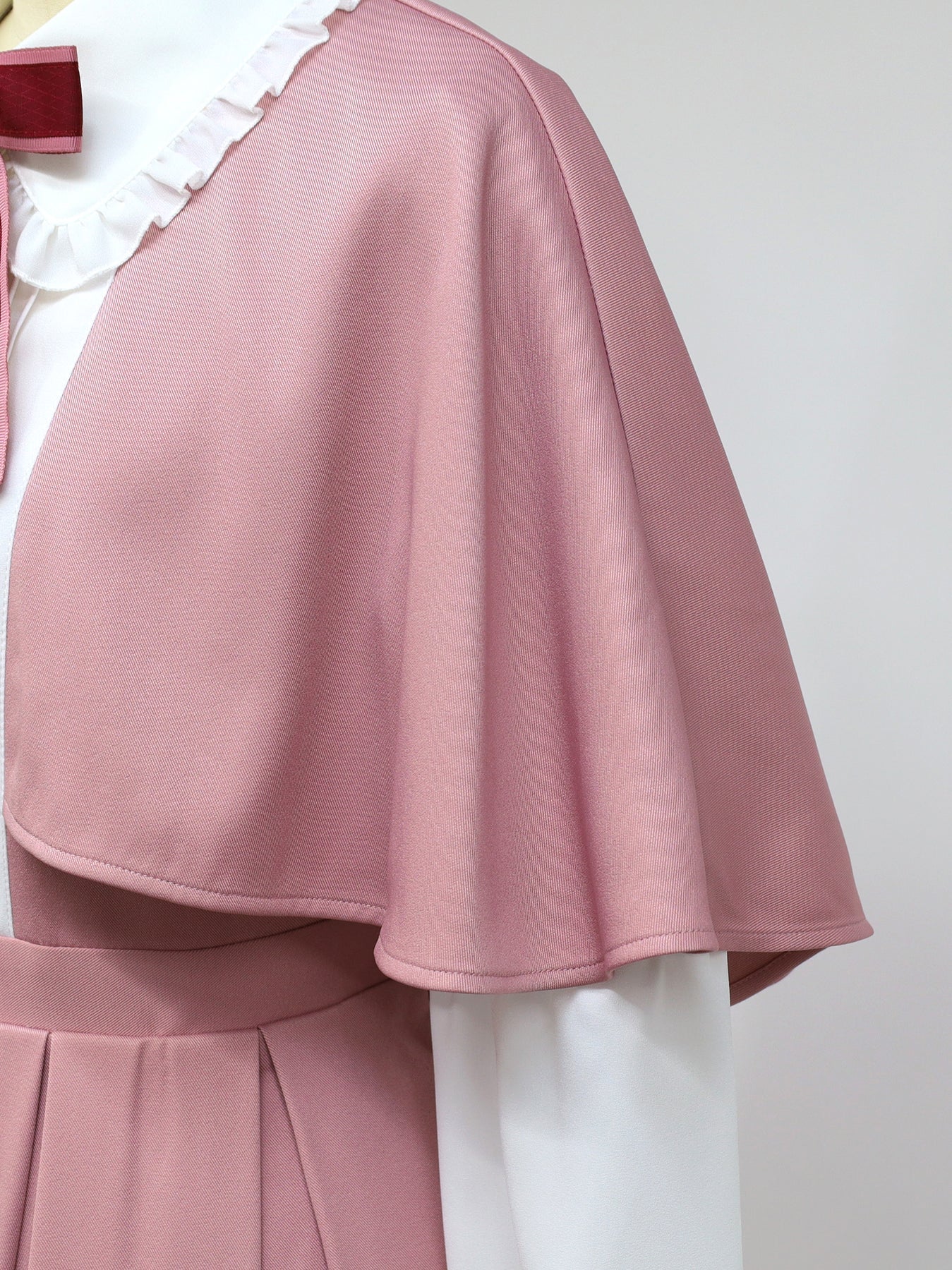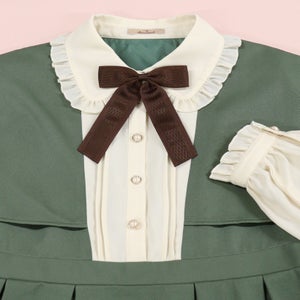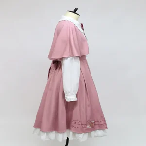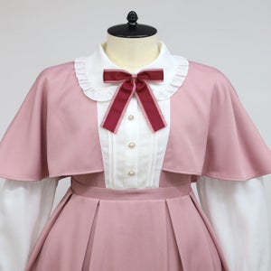 ・フロントボタン開き・サイドファスナー仕様・袖は2way仕様で取り外し可能・ウエストは共生地リボンとゴム仕様でサイズ調節可能・ケープは取り外し不可・リボンブローチは取り外し可能