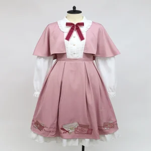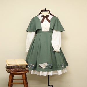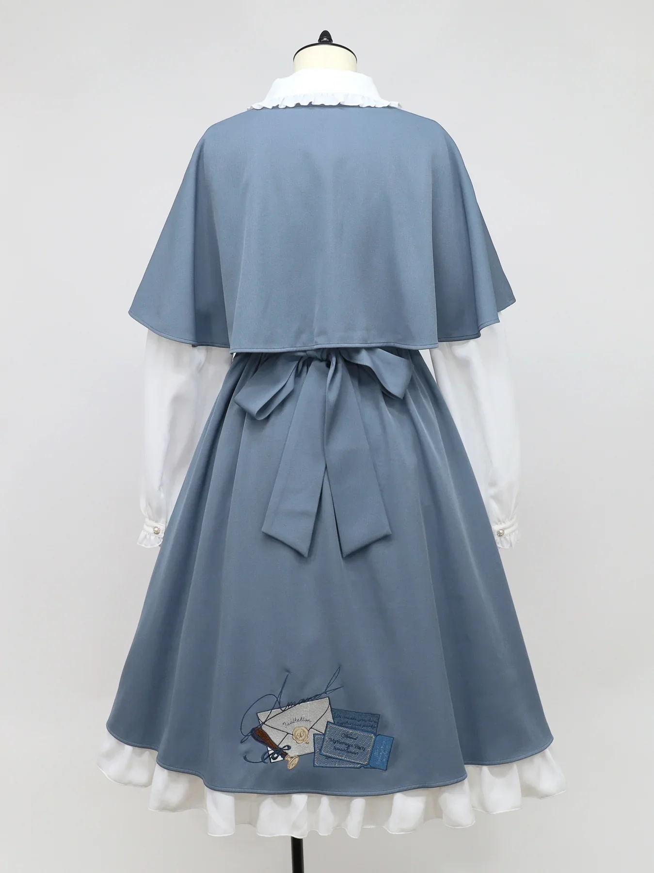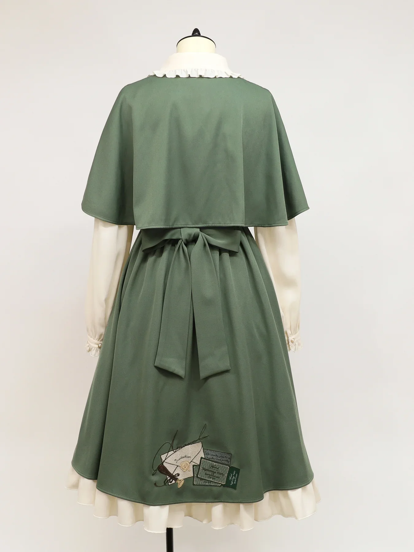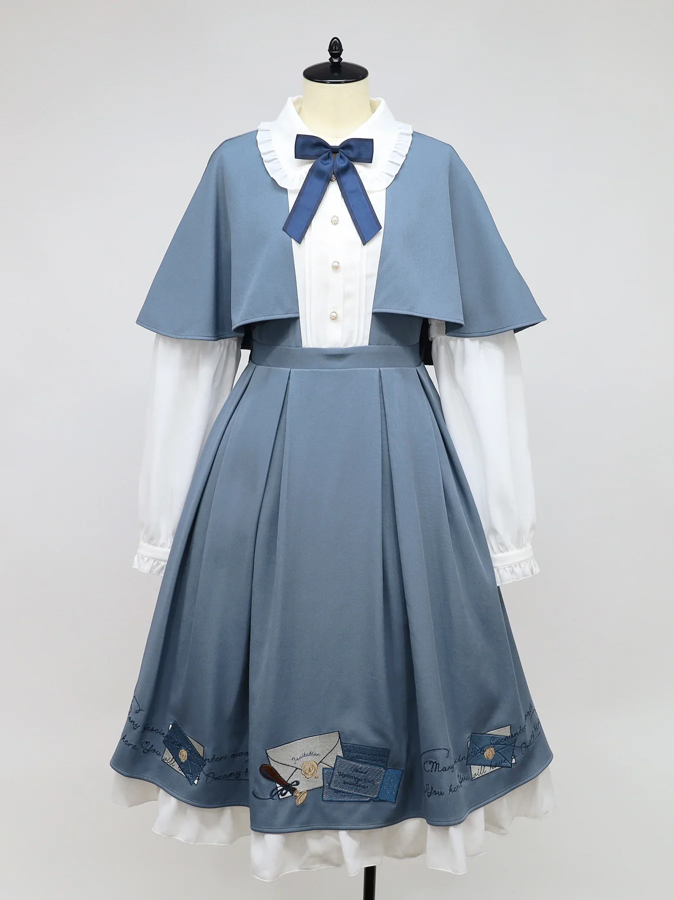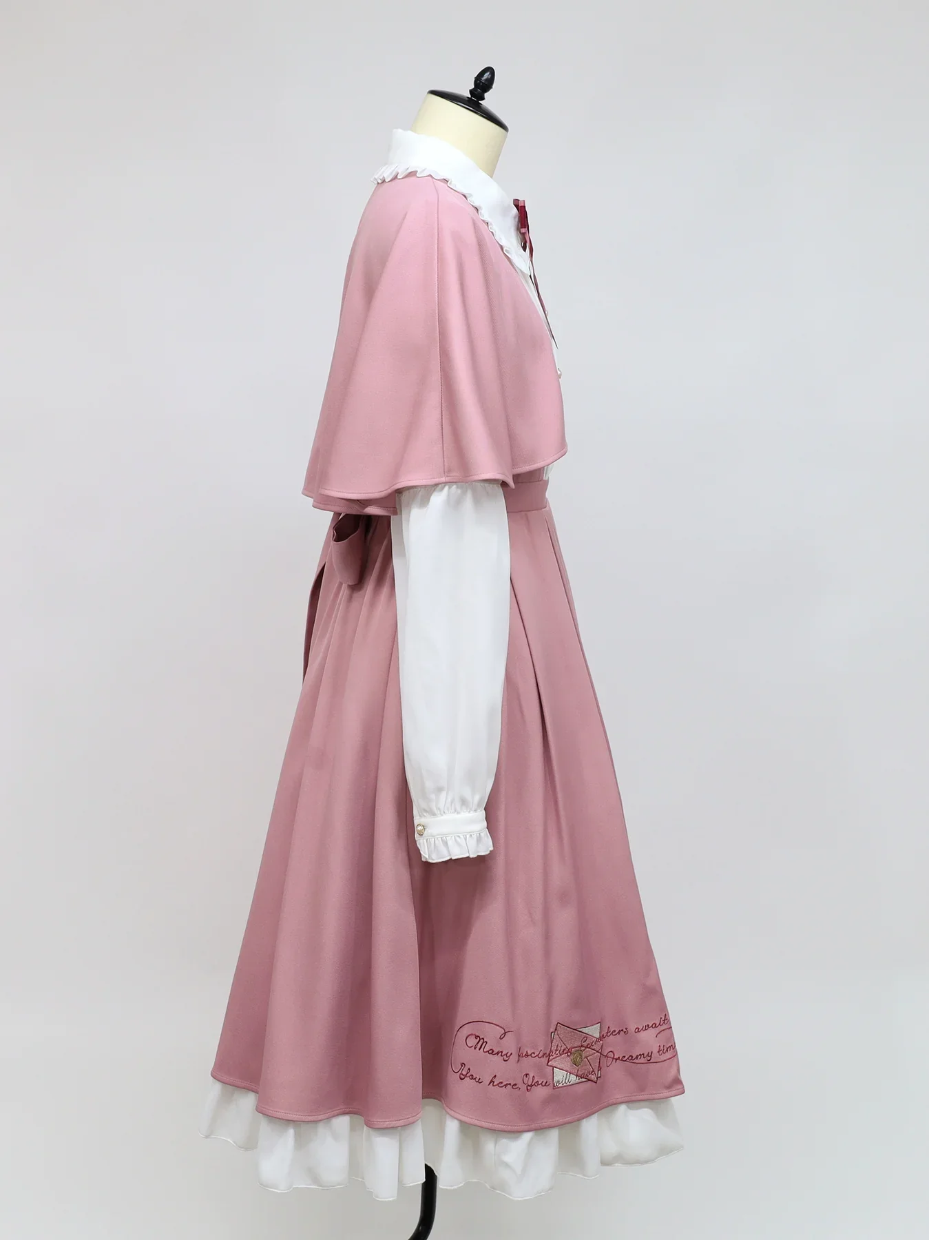 ・フロントボタン開き・サイドファスナー仕様・袖は2way仕様で取り外し可能・ウエストは共生地リボンとゴム仕様でサイズ調節可能・ケープは取り外し不可・リボンブローチは取り外し可能